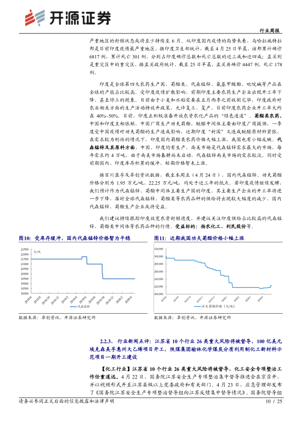 报告分析了印度封锁政策对我国农药进出口的影响,特别是对菊酯类和代森锰锌农药的影响。报告指出,印度封锁导致醚醛中间体供应紧张,菊酯类农药价格上涨;而代森锰锌价格短期平稳,但若印度疫情持续,国内生产企业或将受益。