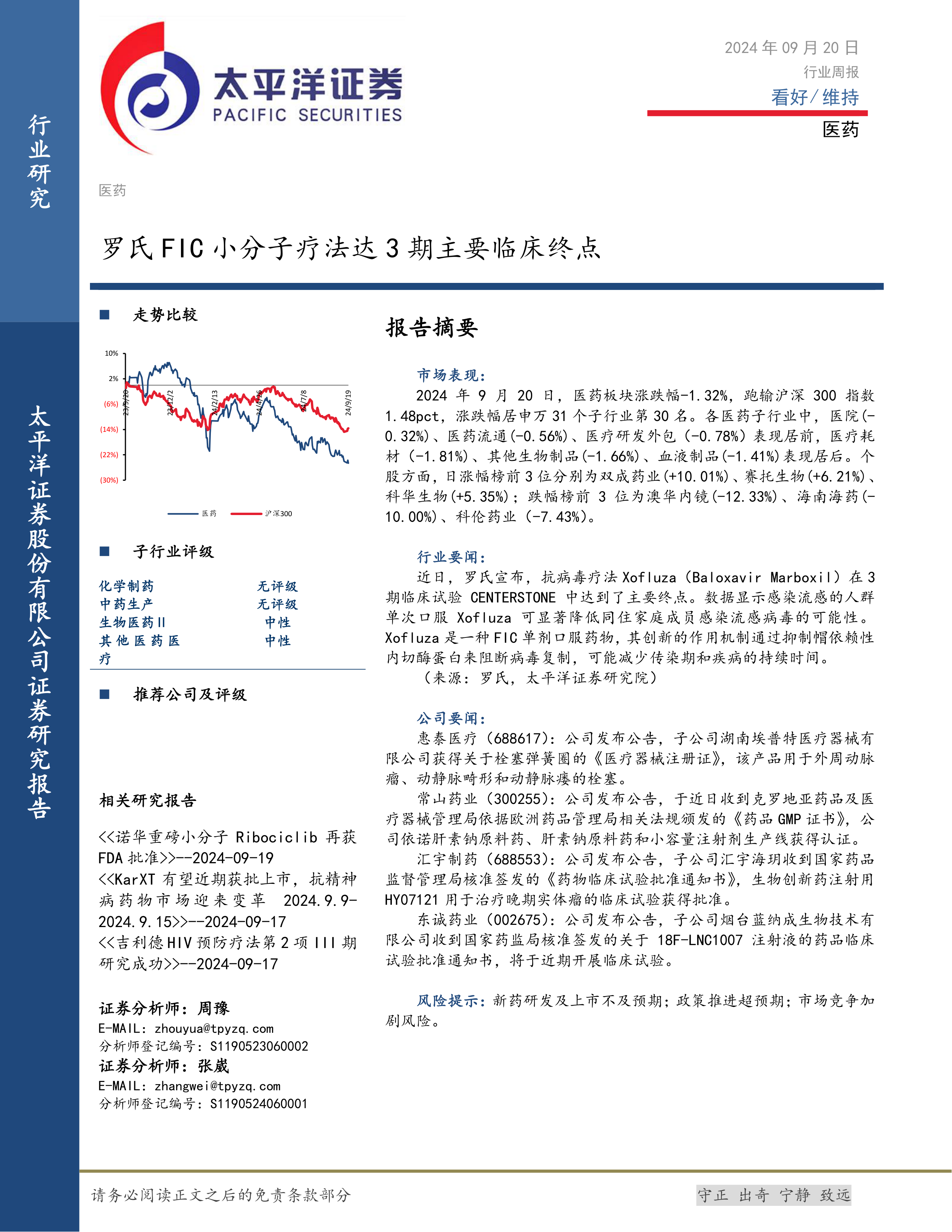 本报告的核心观点是:医药行业整体表现略显低迷,但个别细分领域和公司表现突出。罗氏FIC小分子疗法Xofluza三期临床试验达到主要终点,为该领域带来积极信号。部分公司在产品注册、临床试验方面取得进展,展现行业发展活力。然而,行业整体面临新药研发及上市不及预期、政策推进超预期以及市场竞争加剧等风险。