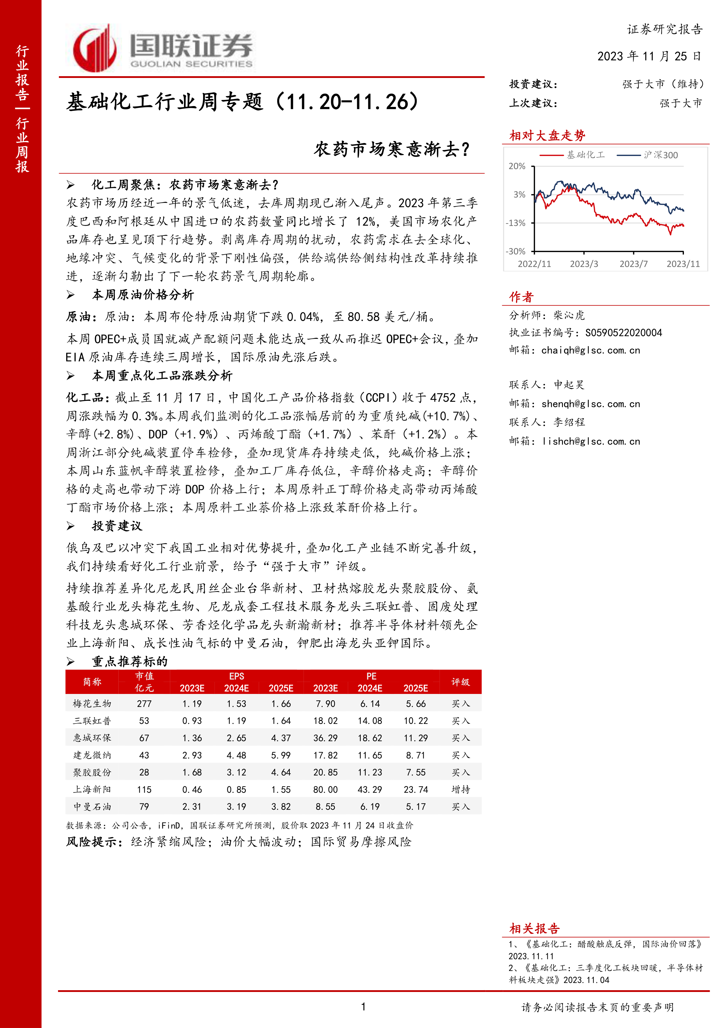 本报告对基础化工行业,特别是农药市场和原油价格进行了深入分析,并对本周化工品价格涨跌情况进行了总结。报告认为农药市场寒意渐退,景气度持续修复,并看好化工行业长期发展前景,但同时也提示了潜在的风险。报告最后提出了多条投资主线,并重点推荐了部分个股,为投资者提供了有价值的参考信息。 报告数据主要来源于中国海关、FRED、Wind、百川盈孚以及国联证券研究所的预测,投资者需谨慎参考。