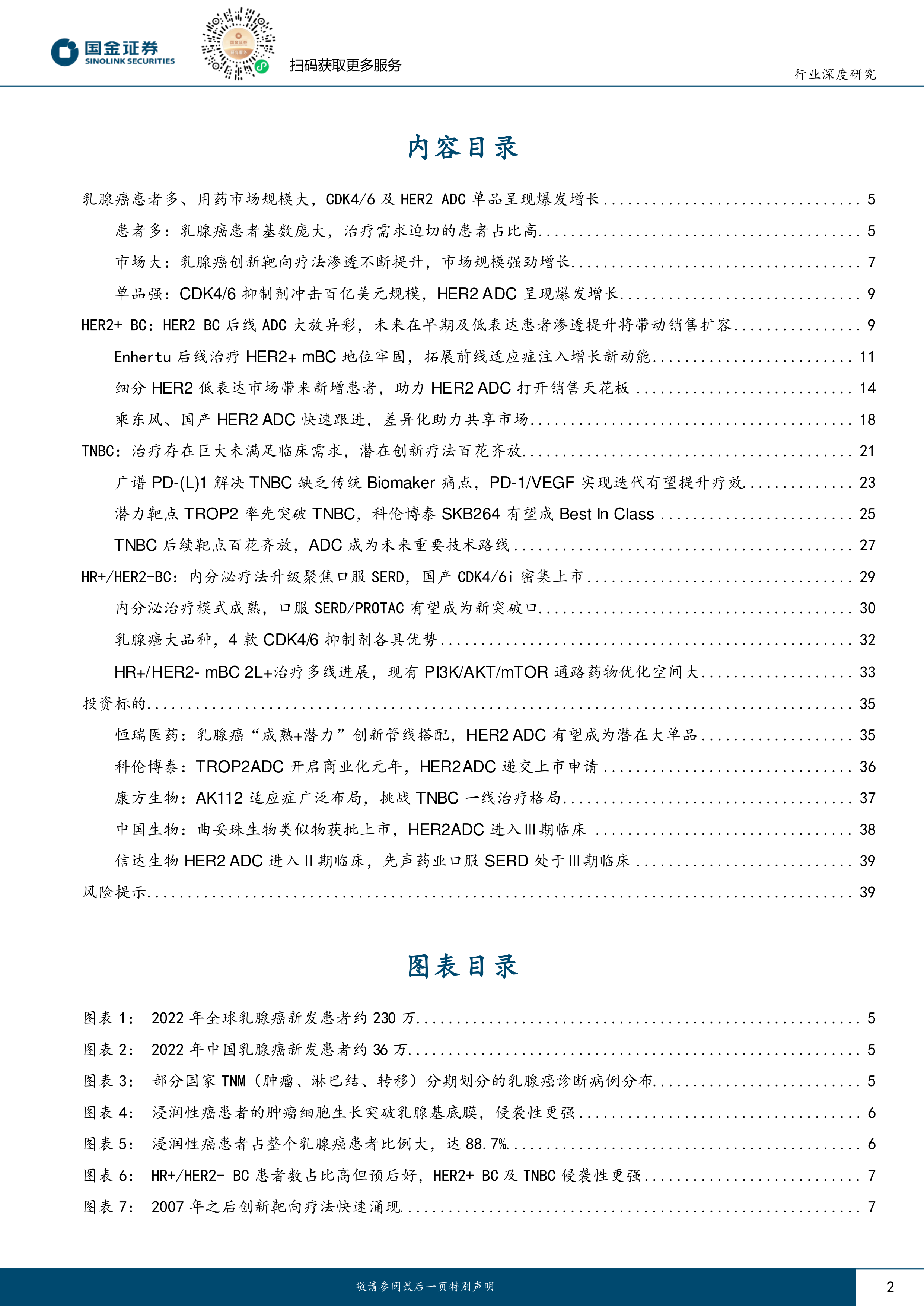 HER2+BC(HER2阳性乳腺癌,占BC比重约20%):HER2BC后线治疗ADC大放异彩,未来在早期及低表达患者渗透提升,将继续带动HER2ADC销售扩容。HER2+BC特征是治疗靶点(HER2)明确,HER2靶向治疗为核心,其中HER2ADC优势明显,尤其是T-DXd在2024年销售额超38亿美元,我们认为该药具备成为百亿分子潜力:T-Dxd适应症将向HER2+BC前线延申;细分HER2低表达患者,带来增量患者空间。映射国内,乘T-Dxd商业化成功带动HER2ADC渗透率提升的东风,随着国产HER2ADC快速跟进,我们认为相关创新药的差异化助力共享市场、放量可期:①国产HER2ADC疗效比肩T-DXd,且安全性更优;②针对HER2乳腺癌开发进展最快为荣昌生物的维迪西妥单抗及科伦博泰的A166;③映恩生物DB-1303布局全球,打开产品销售峰值天花板;④恒瑞医药的SHR-A1811布局适应症广泛,增长后劲充足。另外,围绕患者空间更大的HER2低表达乳腺癌,荣昌生物的维迪西妥单抗、映恩生物的D1303、康宁杰瑞的JSKN-003、正大天晴的TQB2102以及恒瑞医药的SHR-A1811均已入Ⅲ期临床。TNBC(三阴性乳腺癌,占BC比重约15%):治疗存在巨大未满足临床需求,潜在创新疗法百花齐放。该亚型的乳腺癌典型特征为ER/PR和HER2表达缺失,因此:①具有光谱抗癌效应的PD-(L)1能够解决TNBC缺乏生物标志物的痛点,但其疗效有限,因此PD-(L)1双抗成为重要迭代方向,包括康方生物、普米斯、康宁杰瑞的相关双抗均进入Ⅲ期临床。②寻找有效靶点成为理解TNBC竞争格局的关键,相关靶点包括TROP2/NECTIN-4/HER3等,其中科伦博泰的芦康沙妥珠、迈威生物的9MW2821以及百利天恒的BL-B01D1有望成为BIC(Best-in-class)。