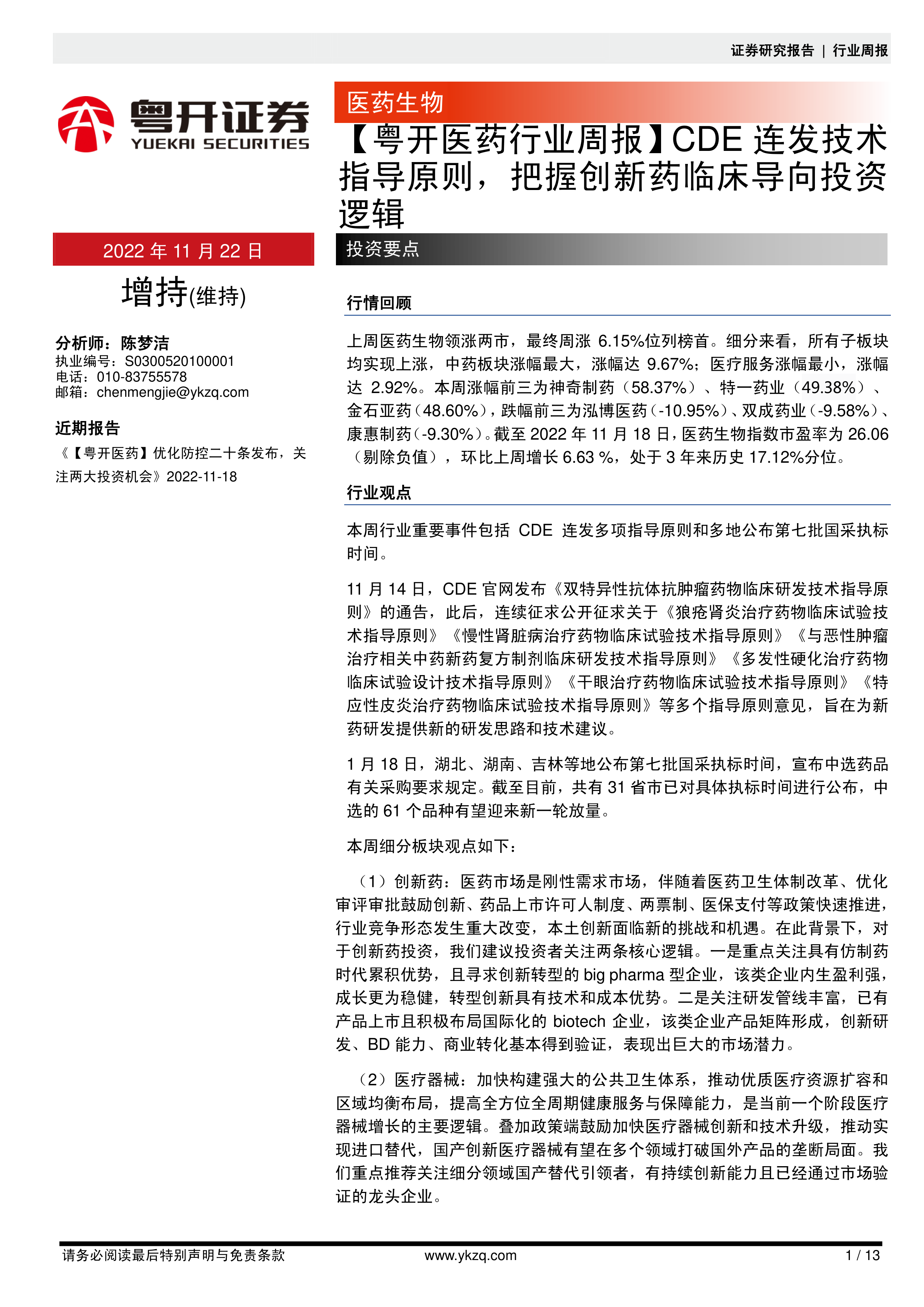 【粤开医药行业周报】CDE连发技术指导原则,把握创新药临床导向投资逻辑