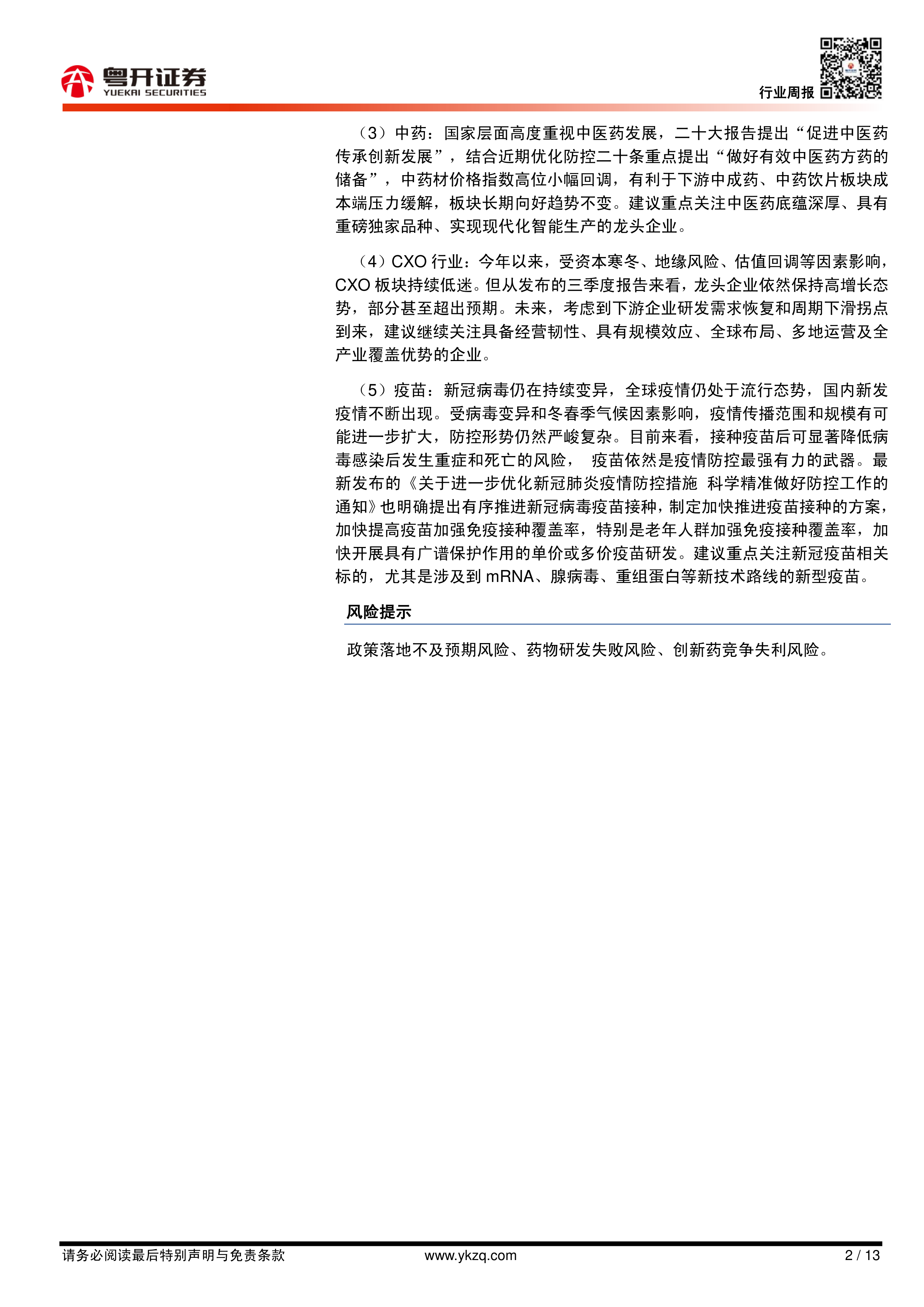 (3)中药:国家层面高度重视中医药发展,二十大报告提出“促进中医药传承创新发展”,结合近期优化防控二十条重点提出“做好有效中医药方药的储备”,中药材价格指数高位小幅回调,有利于下游中成药、中药饮片板块成本端压力缓解,板块长期向好趋势不变。建议重点关注中医药底蕴深厚、具有重磅独家品种、实现现代化智能生产的龙头企业。