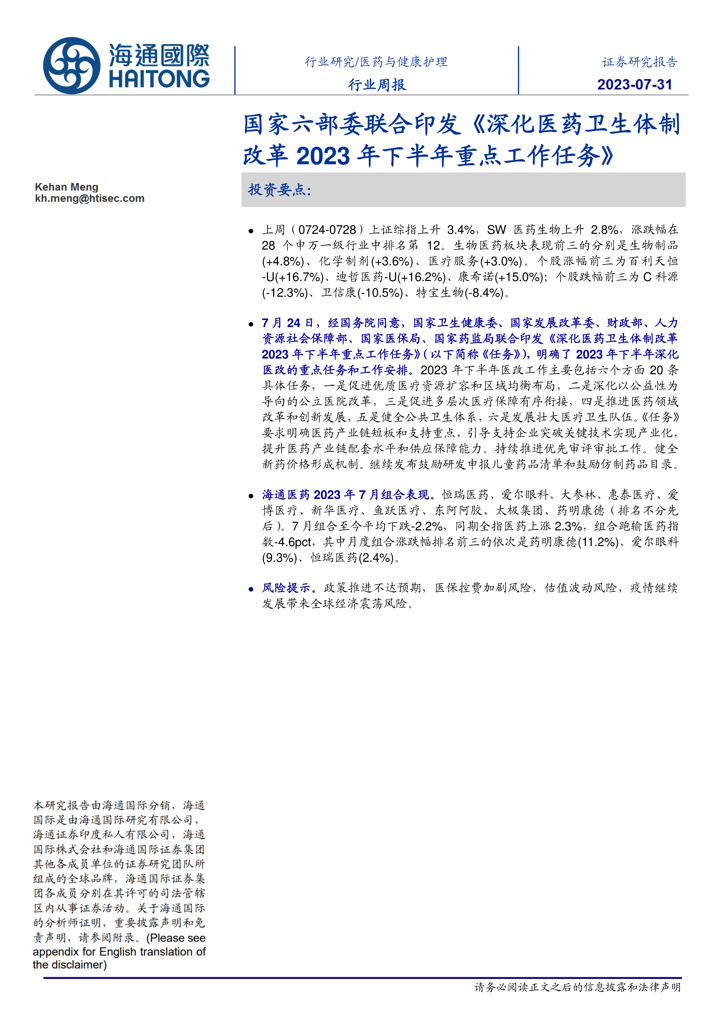 本报告的核心观点是:2023年7月24日,中国六部委联合发布的《深化医药卫生体制改革2023年下半年重点工作任务》为医药行业发展指明了方向,但同时也带来了政策不确定性风险。上周医药生物板块整体表现中等,跑输大盘,个股涨跌分化明显,海通医药7月组合表现亦跑输医药指数。未来行业发展面临政策推进、医保控费、估值波动以及全球经济震荡等多重风险。