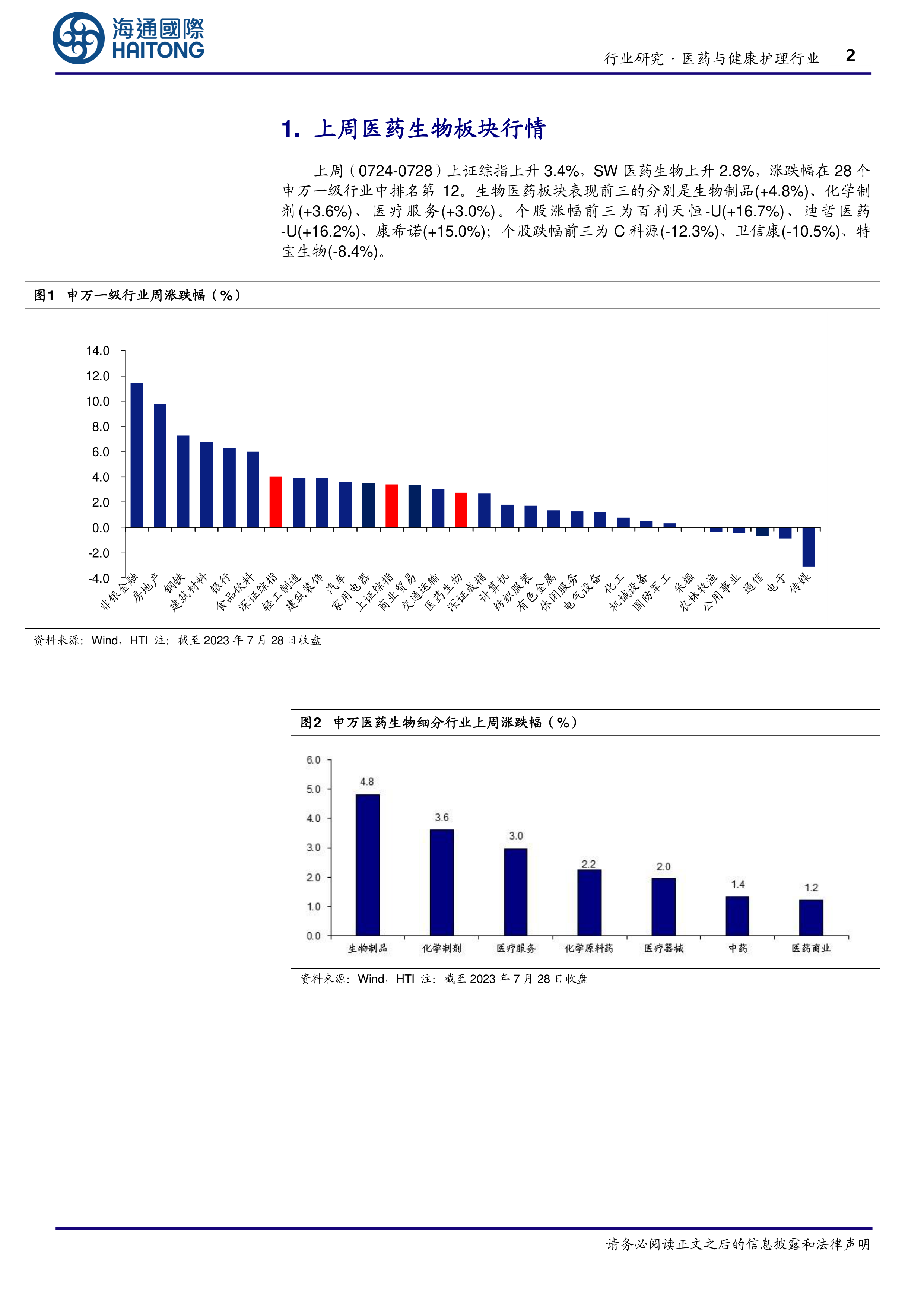 上周( 0724-0728)上证综指上升 3.4%, SW 医药生物上升 2.8%,涨跌幅在28 个申万一级行业中排名第 12。生物医药板块表现前三的分别是生物制品(+4.8%)、化学制剂(+3.6%)、医疗服务(+3.0%)。个股涨幅前三为百利天恒-U(+16.7%)、迪哲医药-U(+16.2%)、康希诺(+15.0%);个股跌幅前三为 C 科源(-12.3%)、卫信康(-10.5%)、特宝生物(-8.4%)。