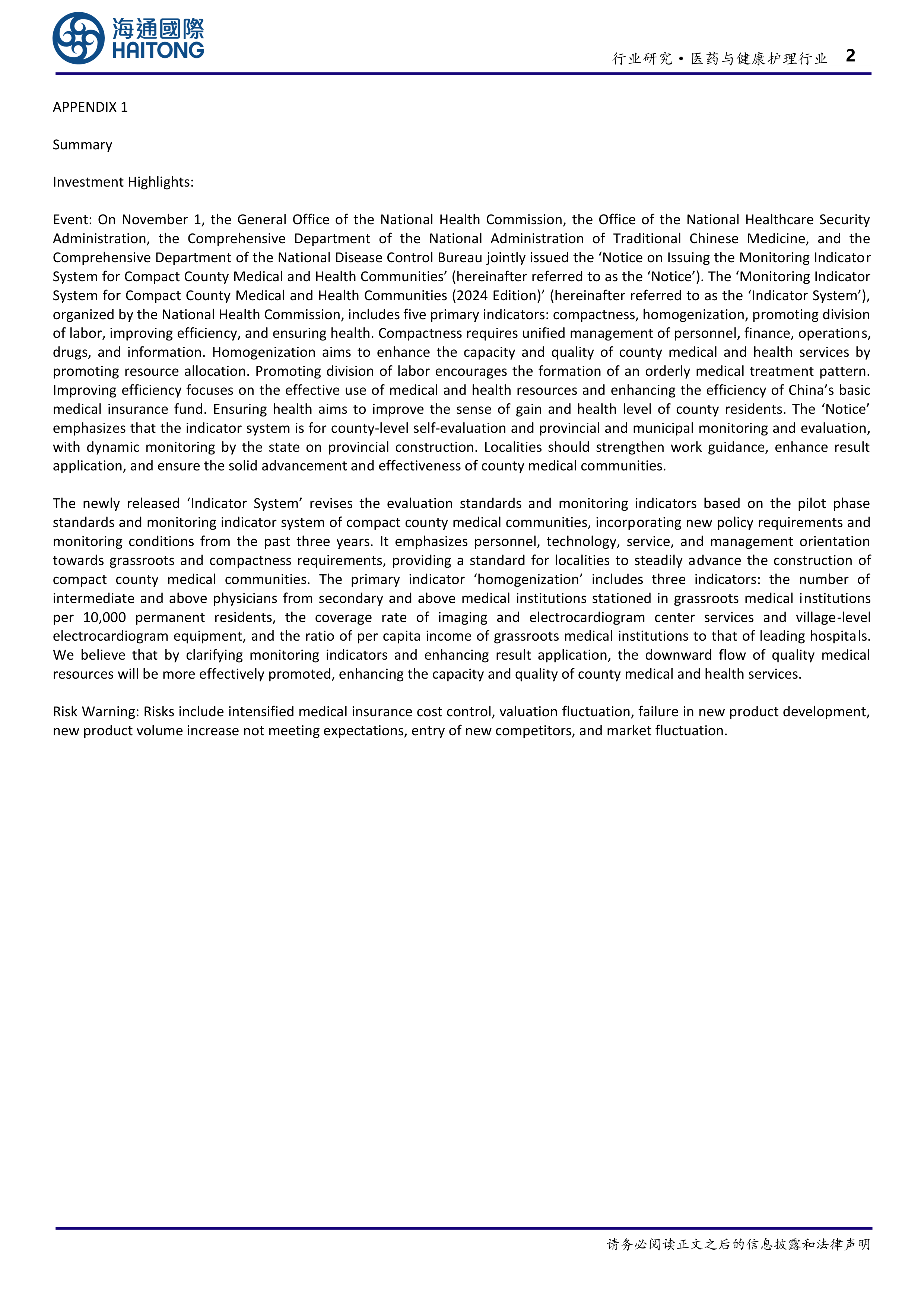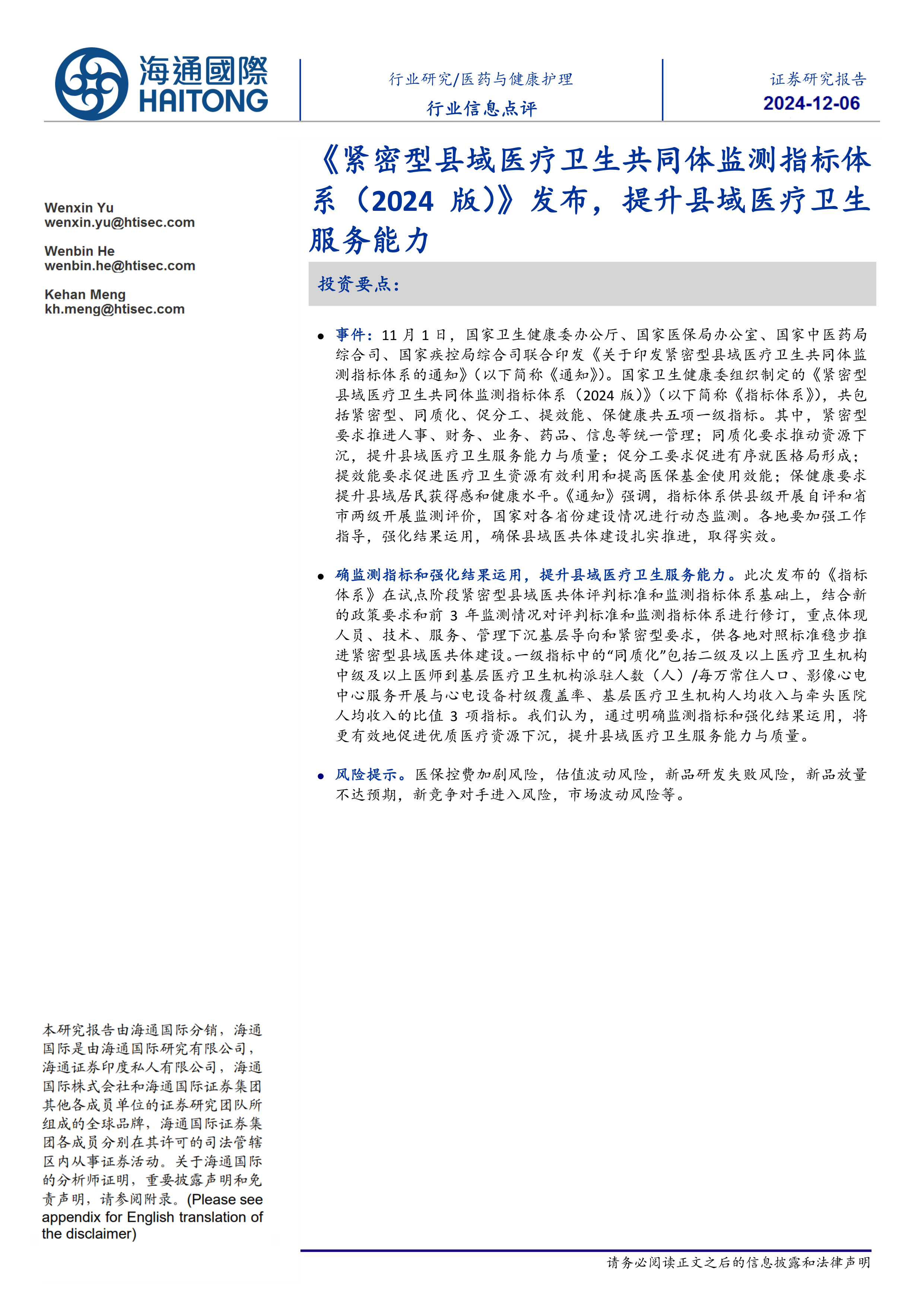 医药与健康护理行业信息点评:《紧密型县域医疗卫生共同体监测指标体系(2024版)》发布,提升县域医疗卫生服务能力