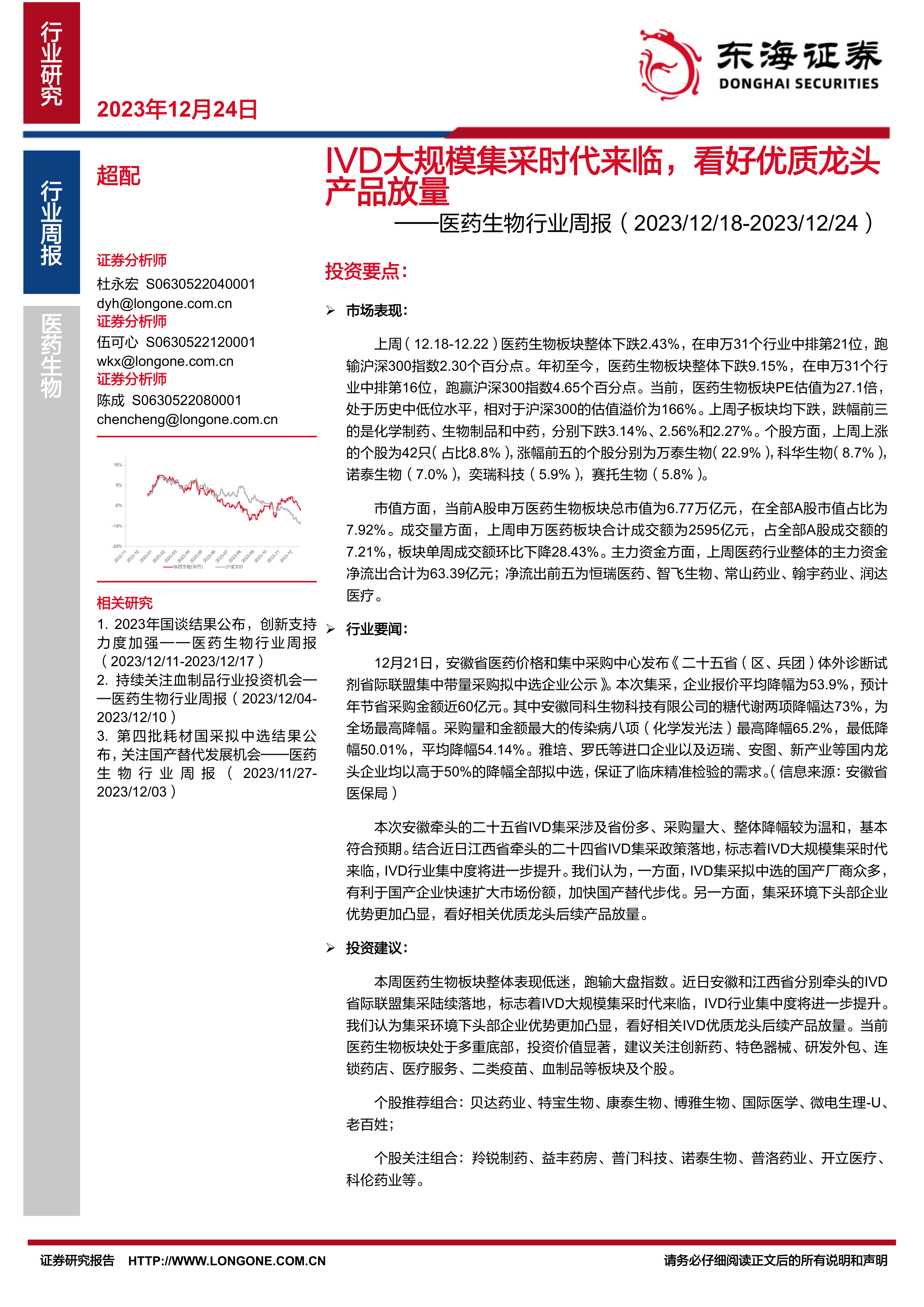 医药生物行业周报:IVD大规模集采时代来临,看好优质龙头产品放量