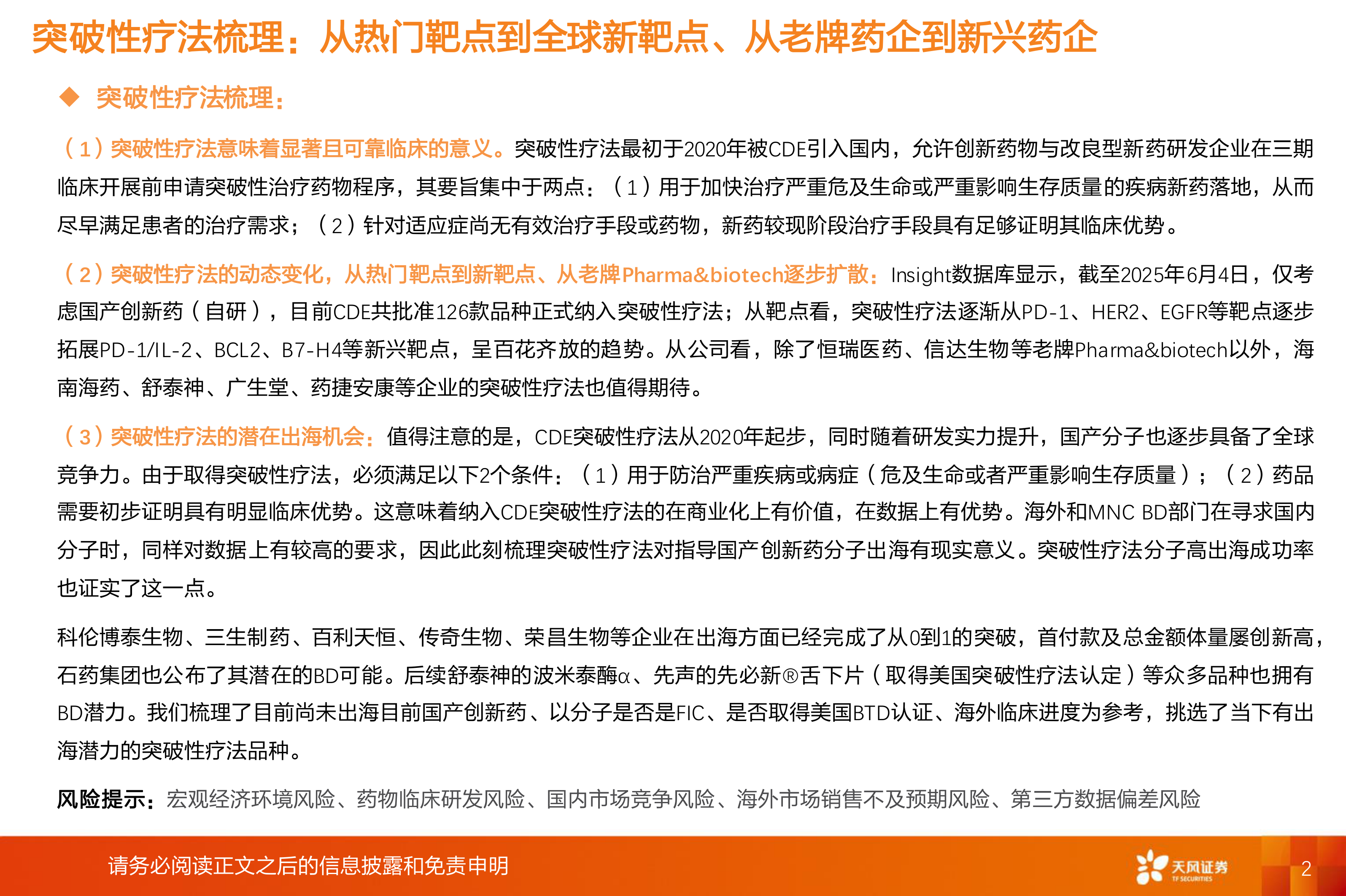 (2)突破性疗法的动态变化,从热门靶点到新靶点、从老牌Pharma&biotech逐步扩散:Insight数据库显示,截至2025年6月4日,仅考虑国产创新药(自研),目前CDE共批准126款品种正式纳入突破性疗法;从靶点看,突破性疗法逐渐从PD-1、HER2、EGFR等靶点逐步拓展PD-1/IL-2、BCL2、B7-H4等新兴靶点,呈百花齐放的趋势。从公司看,除了恒瑞医药、信达生物等老牌Pharma&biotech以外,海南海药、舒泰神、广生堂、药捷安康等企业的突破性疗法也值得期待。