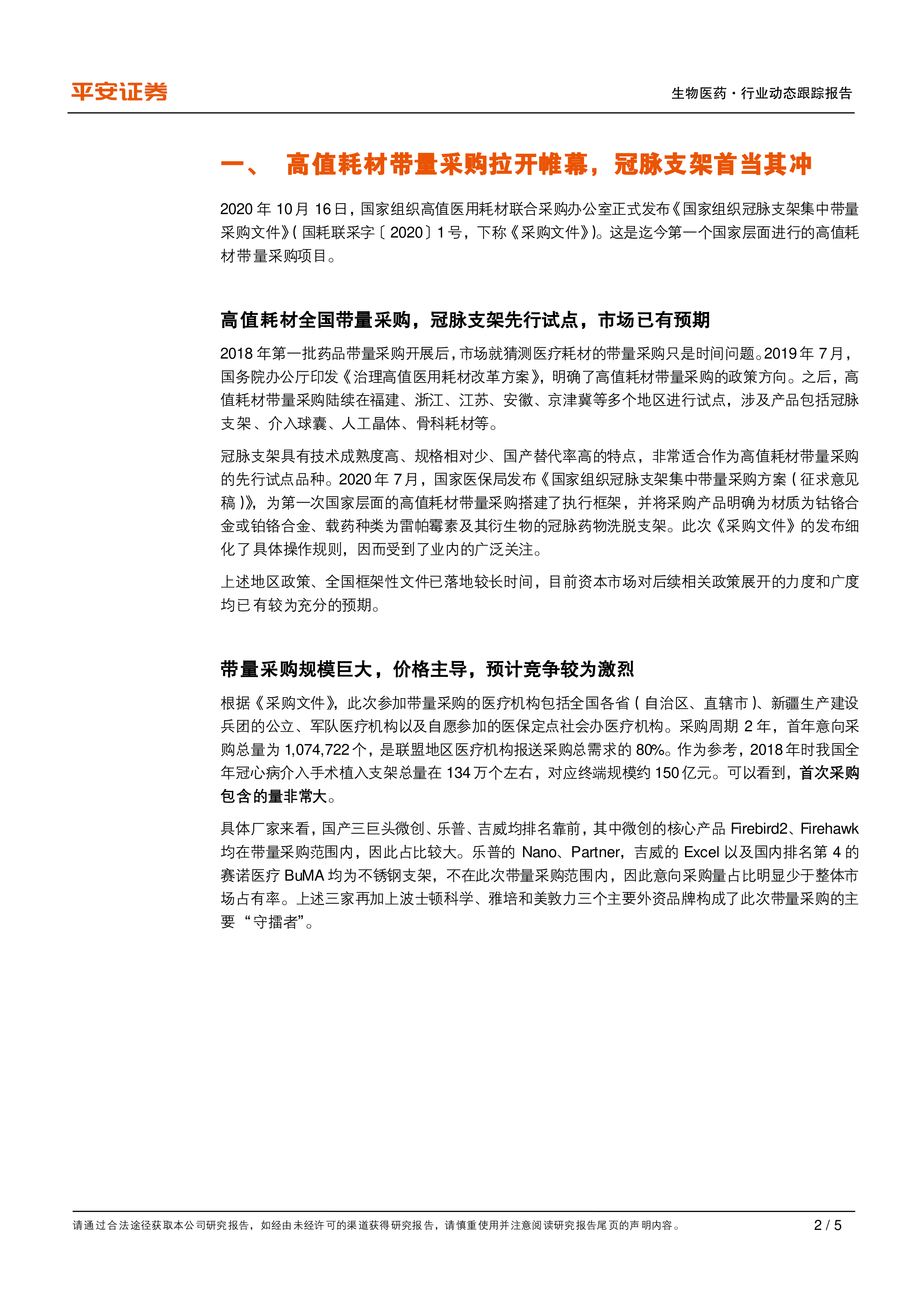 生物医药行业动态跟踪报告:高值耗材带量采购拉开帷幕,冠脉支架首当其冲