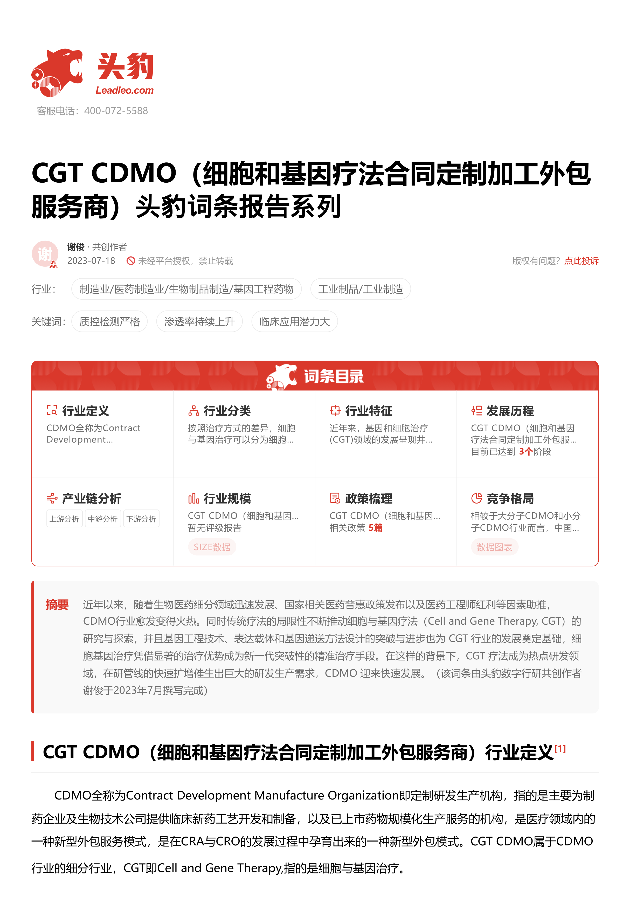 CGT CDMO(细胞和基因疗法合同定制加工外包服务商) 头豹词条报告系列