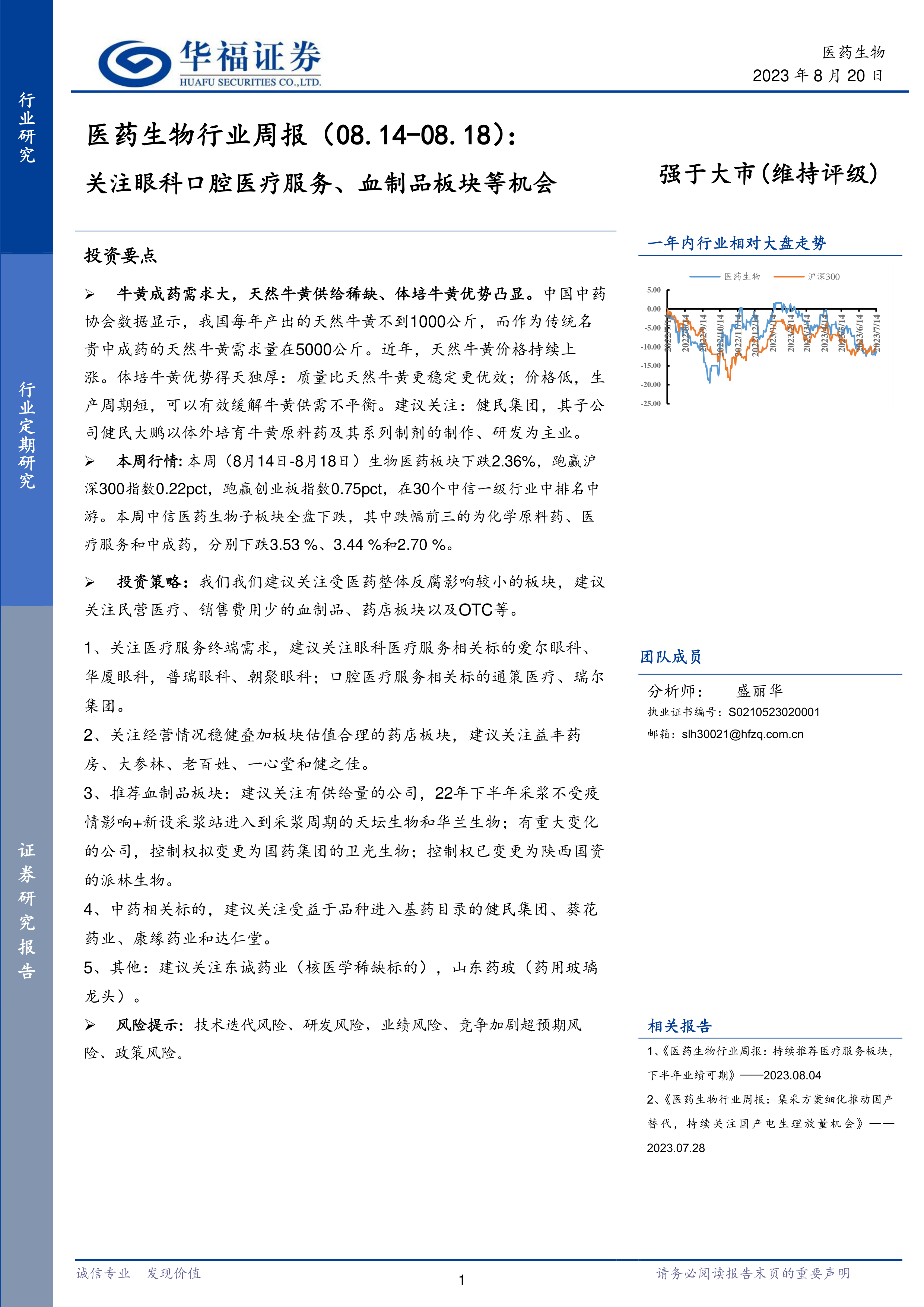 本报告对医药生物行业近期市场表现、重点事件以及投资机会进行了全面分析。报告指出,尽管本周医药生物板块整体表现略逊于大盘,但体培牛黄市场以及部分抗风险能力较强的细分板块仍存在投资机会。报告提供的投资建议和风险提示,为投资者提供了重要的参考信息。 报告强调了在医药反腐的大背景下,选择抗风险能力强的公司和板块的重要性,并对未来市场走势进行了展望,提示投资者需关注技术迭代风险、研发风险、业绩风险、竞争加剧风险和政策风险。