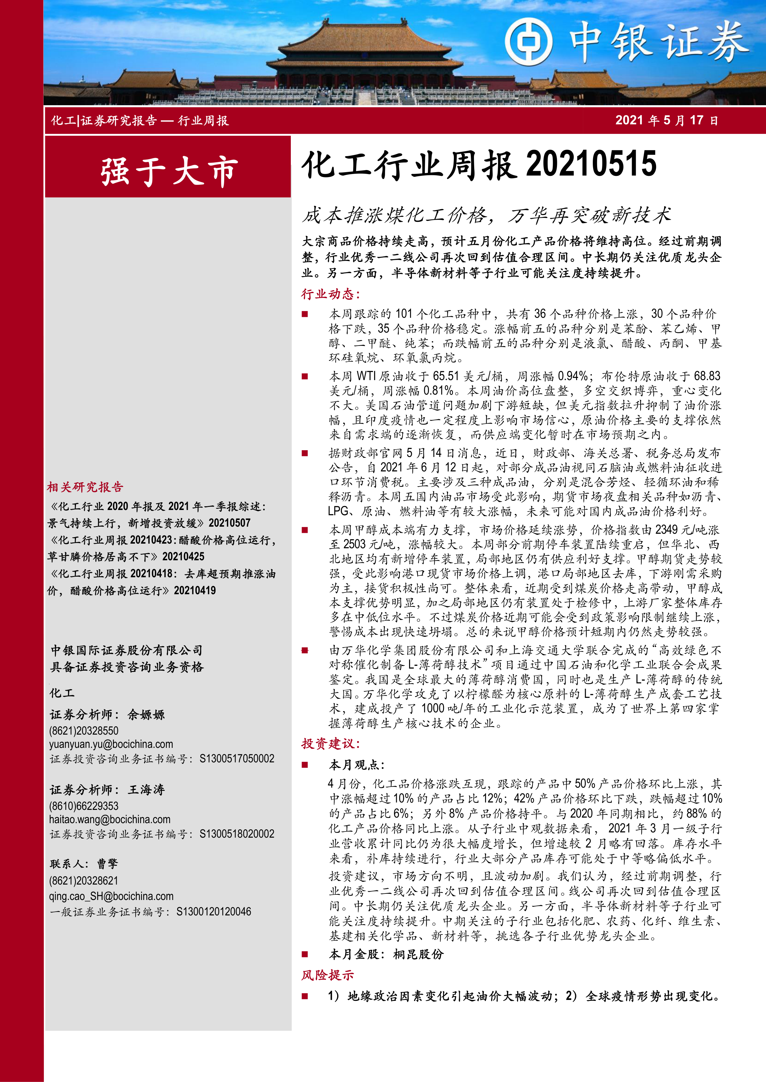 化工行业周报:成本推涨煤化工价格,万华再突破新技术