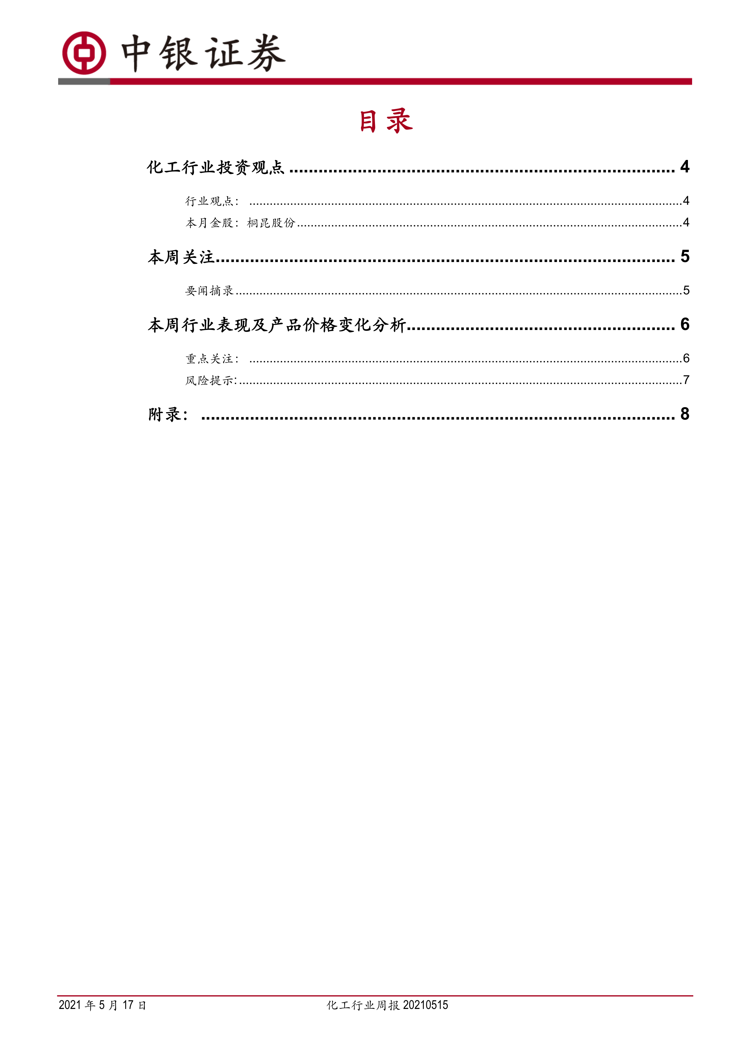 本报告对2021年5月化工行业进行了周度分析,涵盖了行业整体表现、重点产品价格波动、龙头企业估值以及未来发展趋势等方面。报告指出,化工行业价格波动加剧,但优质龙头企业估值回归合理区间,中长期仍值得关注。部分子行业,如半导体新材料,关注度持续提升。报告还对桐昆股份进行了详细的个股分析,并给出了买入评级。最后,报告提示了地缘政治和疫情等潜在风险。 报告数据主要来自百川盈孚和万得数据库,并结合中银证券的分析。 投资者需谨慎参考,并结合自身情况进行独立判断。