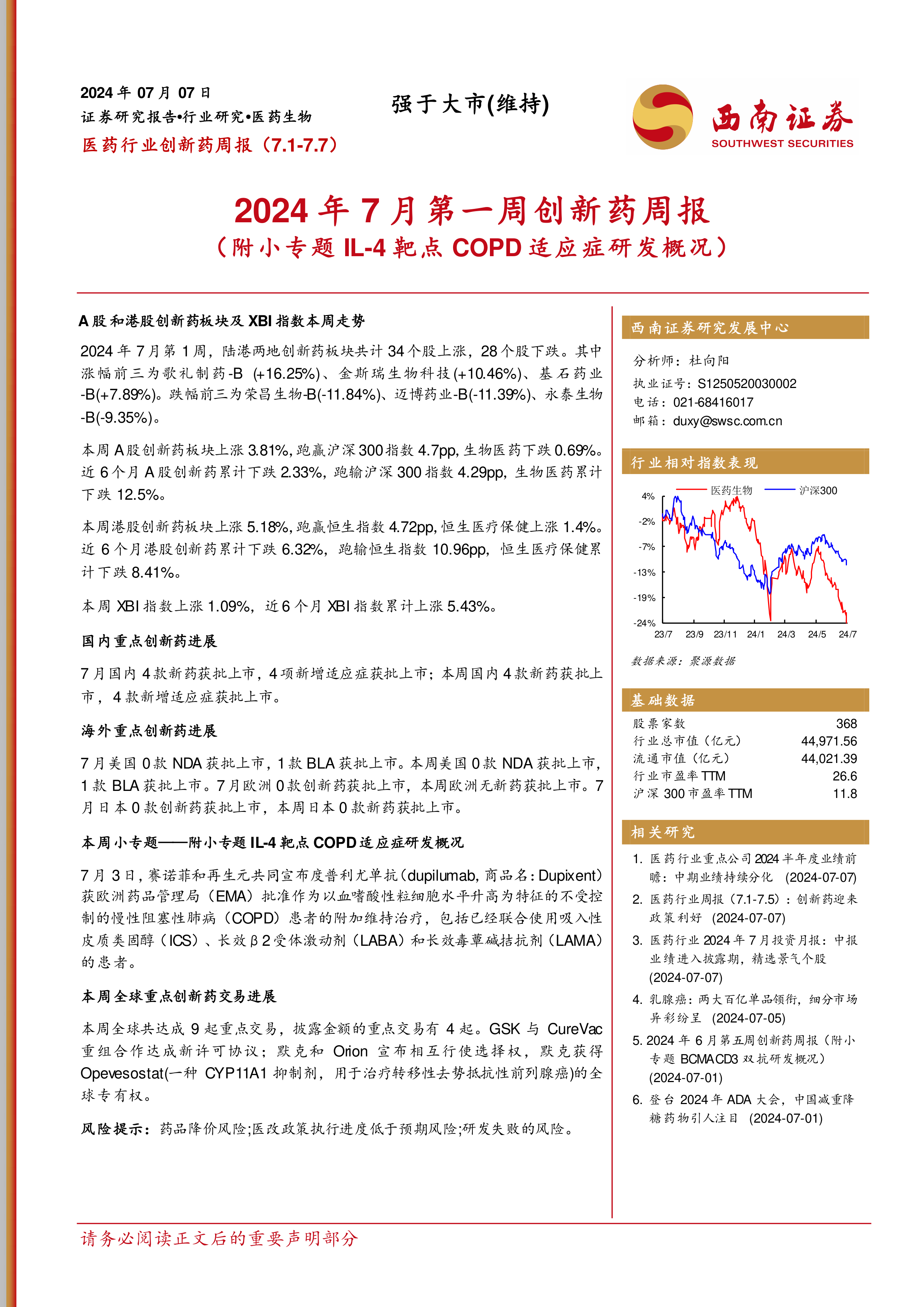 2024年7月第一周创新药周报(附小专题IL-4靶点COPD适应症研发概况)