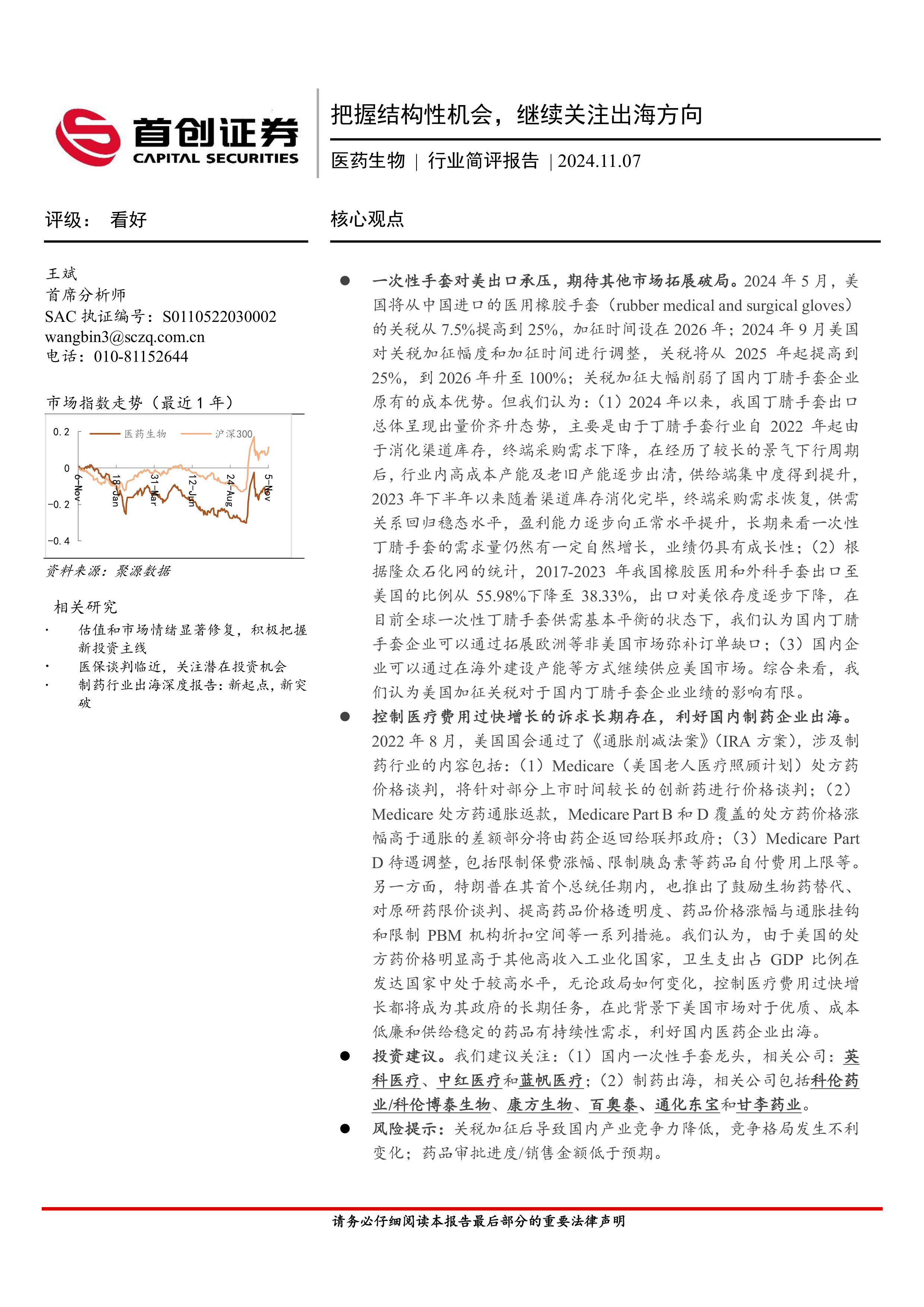 本报告的核心观点是:尽管美国对中国进口的丁腈手套加征关税对国内企业造成一定冲击,但中国一次性手套行业,特别是丁腈手套行业,仍具备较强的增长潜力。这种潜力主要源于行业供给侧的优化、国内外市场需求的持续增长以及企业积极的应对策略,例如拓展海外市场和海外建厂。此外,报告还指出,控制医疗费用增长的长期诉求将持续利好国内制药企业出海,为中国医药行业带来新的增长机遇。