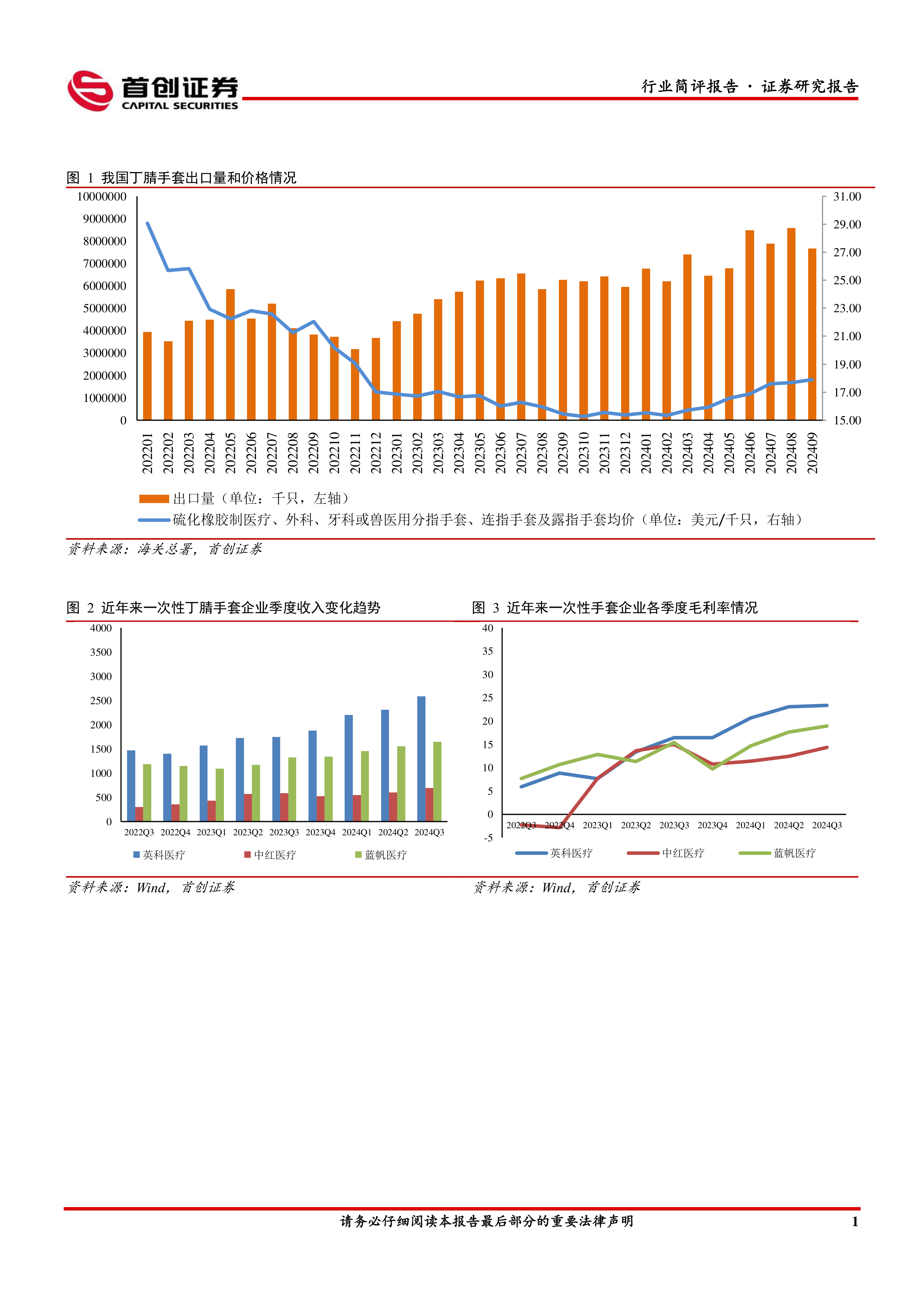 一次性手套对美出口承压,期待其他市场拓展破局。2024年5月,美国将从中国进口的医用橡胶手套(rubber medical and surgical gloves)的关税从7.5%提高到25%,加征时间设在2026年;2024年9月美国对关税加征幅度和加征时间进行调整,关税将从2025年起提高到25%,到2026年升至100%;关税加征大幅削弱了国内丁腈手套企业原有的成本优势。但我们认为:(1)2024年以来,我国丁腈手套出口总体呈现出量价齐升态势,主要是由于丁腈手套行业自2022年起由于消化渠道库存,终端采购需求下降,在经历了较长的景气下行周期后,行业内高成本产能及老旧产能逐步出清,供给端集中度得到提升,2023年下半年以来随着渠道库存消化完毕,终端采购需求恢复,供需关系回归稳态水平,盈利能力逐步向正常水平提升,长期来看一次性丁腈手套的需求量仍然有一定自然增长,业绩仍具有成长性;(2)根据隆众石化网的统计,2017-2023年我国橡胶医用和外科手套出口至美国的比例从55.98%下降至38.33%,出口对美依存度逐步下降,在目前全球一次性丁腈手套供需基本平衡的状态下,我们认为国内丁腈手套企业可以通过拓展欧洲等非美国市场弥补订单缺口;(3)国内企业可以通过在海外建设产能等方式继续供应美国市场。综合来看,我们认为美国加征关税对于国内丁腈手套企业业绩的影响有限。