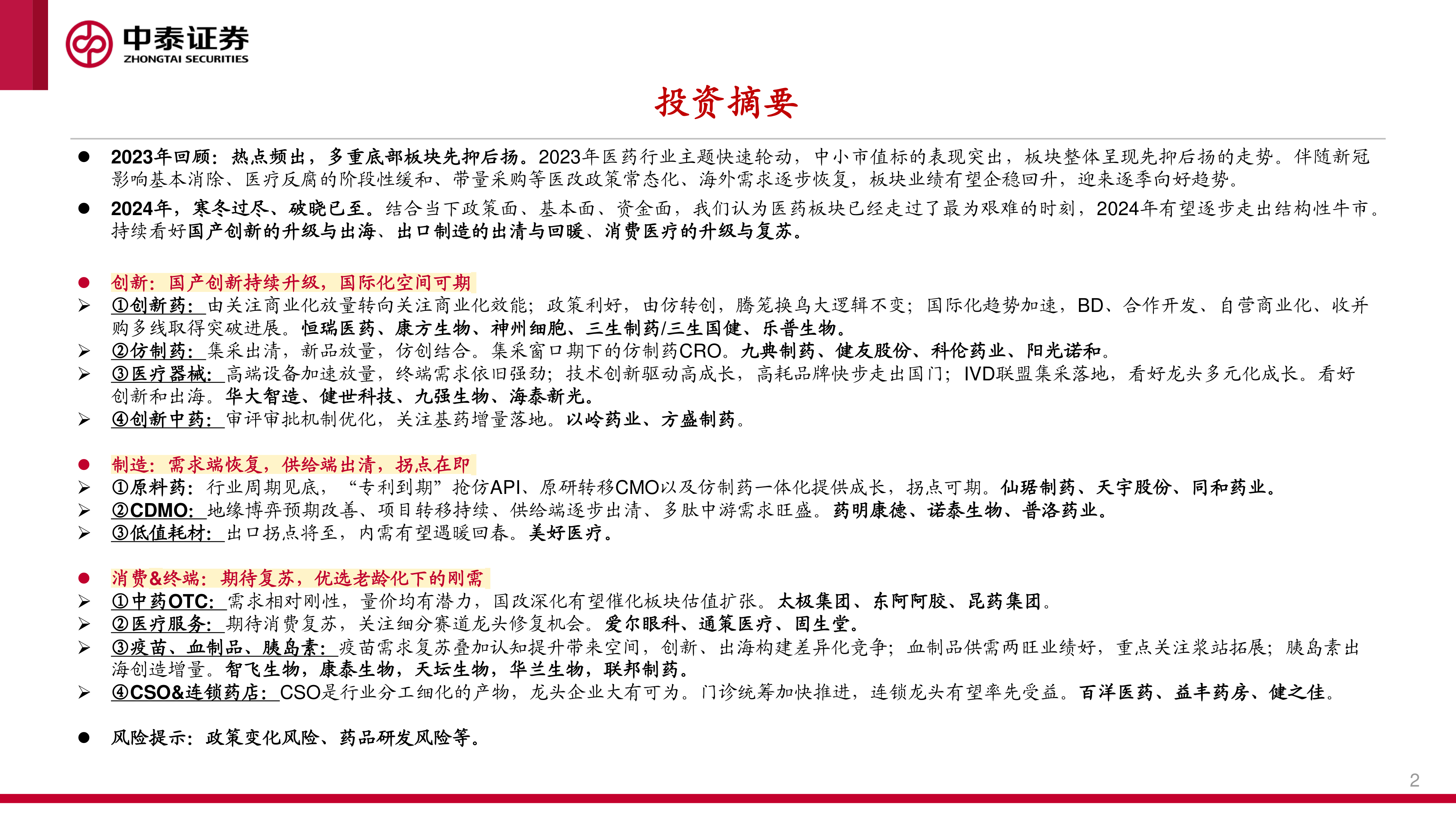 2024年,寒冬过尽、破晓已至。结合当下政策面、基本面、资金面,我们认为医药板块已经走过了最为艰难的时刻,2024年有望逐步走出结构性牛市。持续看好国产创新的升级与出海、出口制造的出清与回暖、消费医疗的升级与复苏。
