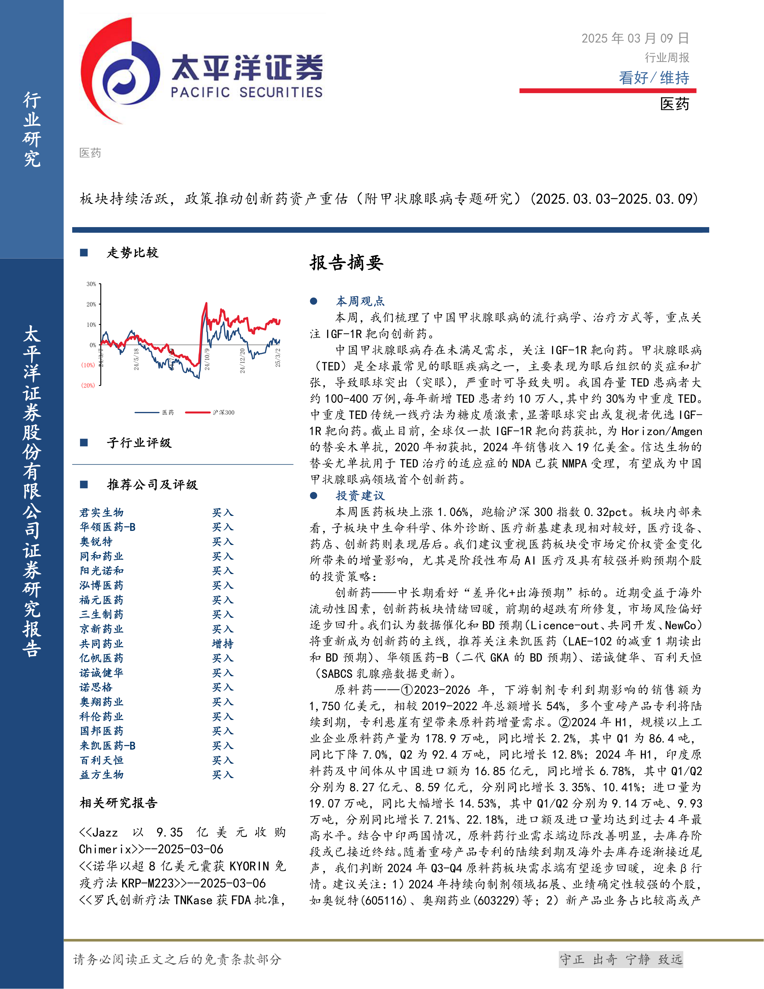 本报告的核心观点是:医药板块持续活跃,政策推动创新药资产重估。具体而言,报告关注中国甲状腺眼病(TED)领域的未满足需求和IGF-1R靶向药物的市场潜力,并对创新药、原料药、CXO和仿制药四个子行业进行了分析,提出了相应的投资建议。