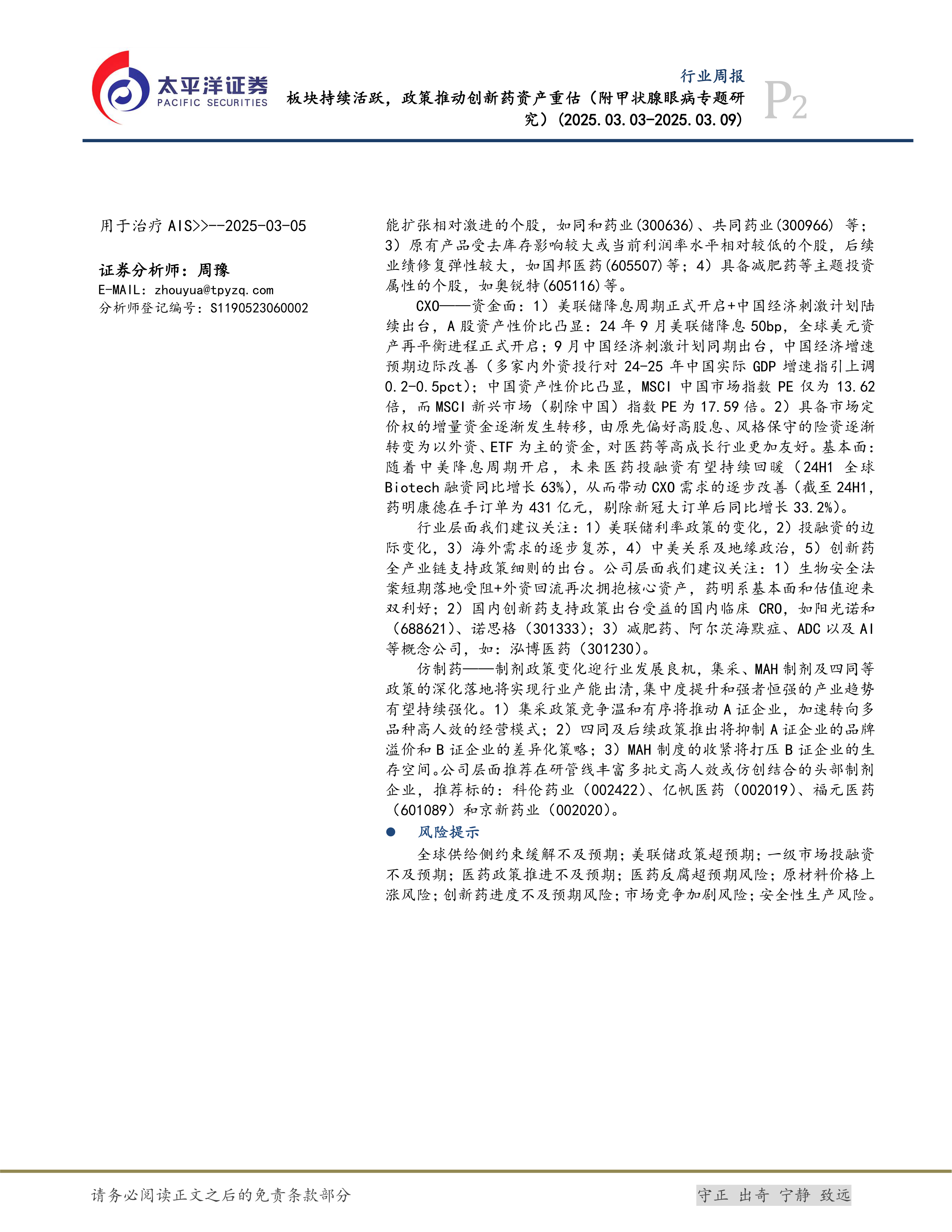 本报告对医药板块的整体表现、各子行业发展趋势以及重点公司进行了深入分析,并结合市场数据和政策环境,提出了相应的投资建议。报告特别关注了中国甲状腺眼病领域的投资机会,以及创新药、原料药、CXO和仿制药四个子行业的未来发展前景。 投资者需注意报告中提到的风险提示,并根据自身情况进行投资决策。 报告信息仅供参考,不构成投资建议。