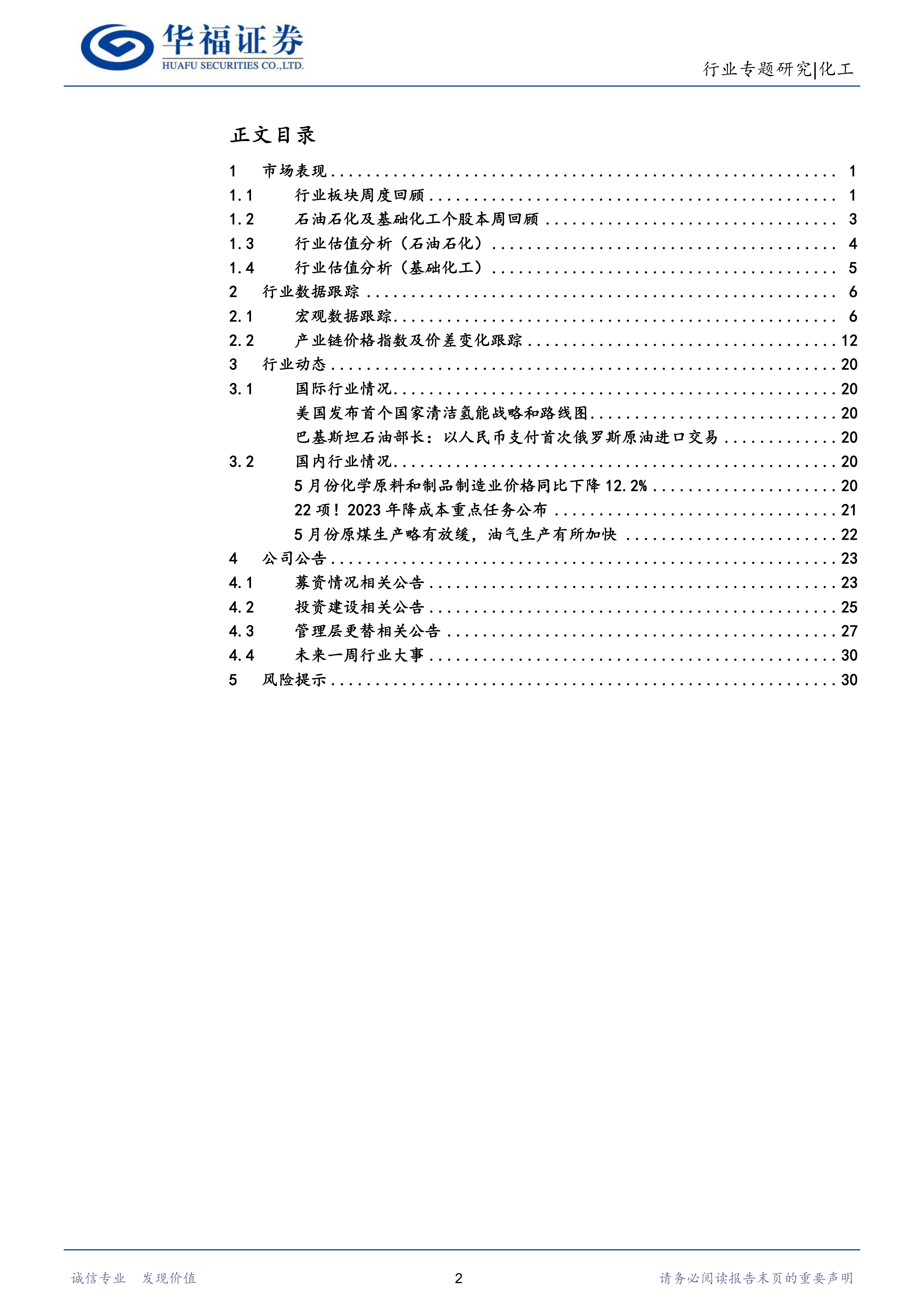 报告总结了近期国内外化工行业的重大事件,例如美国发布国家清洁氢能战略和路线图、巴基斯坦以人民币支付俄罗斯原油等国际新闻,以及国内5月份化工产品价格下降、降成本重点任务公布等国内政策。 这些动态信息为投资者提供了对化工行业未来发展趋势的参考。