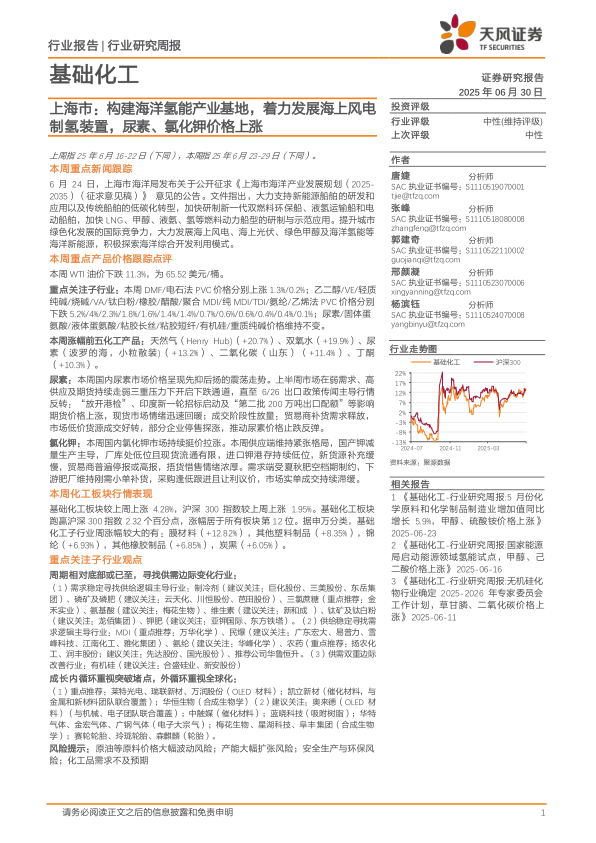 基础化工行业研究周报:上海市,构建海洋氢能产业基地,着力发展海上风电制氢装置,尿素、氯化钾价格上涨