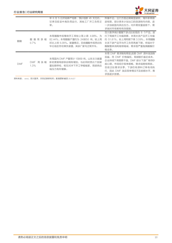 重点关注子行业:本周DMF/电石法PVC价格分别上涨1.3%/0.2%;乙二醇/VE/轻质纯碱/烧碱/VA/钛白粉/橡胶/醋酸/聚合MDI/纯MDI/TDI/氨纶/乙烯法PVC价格分别下跌5.2%/4%/2.3%/1.8%/1.6%/1.4%/1.4%/0.7%/0.6%/0.6%/0.4%/0.4%/0.1%;尿素/固体蛋氨酸/液体蛋氨酸/粘胶长丝/粘胶短纤/有机硅/重质纯碱价格维持不变。