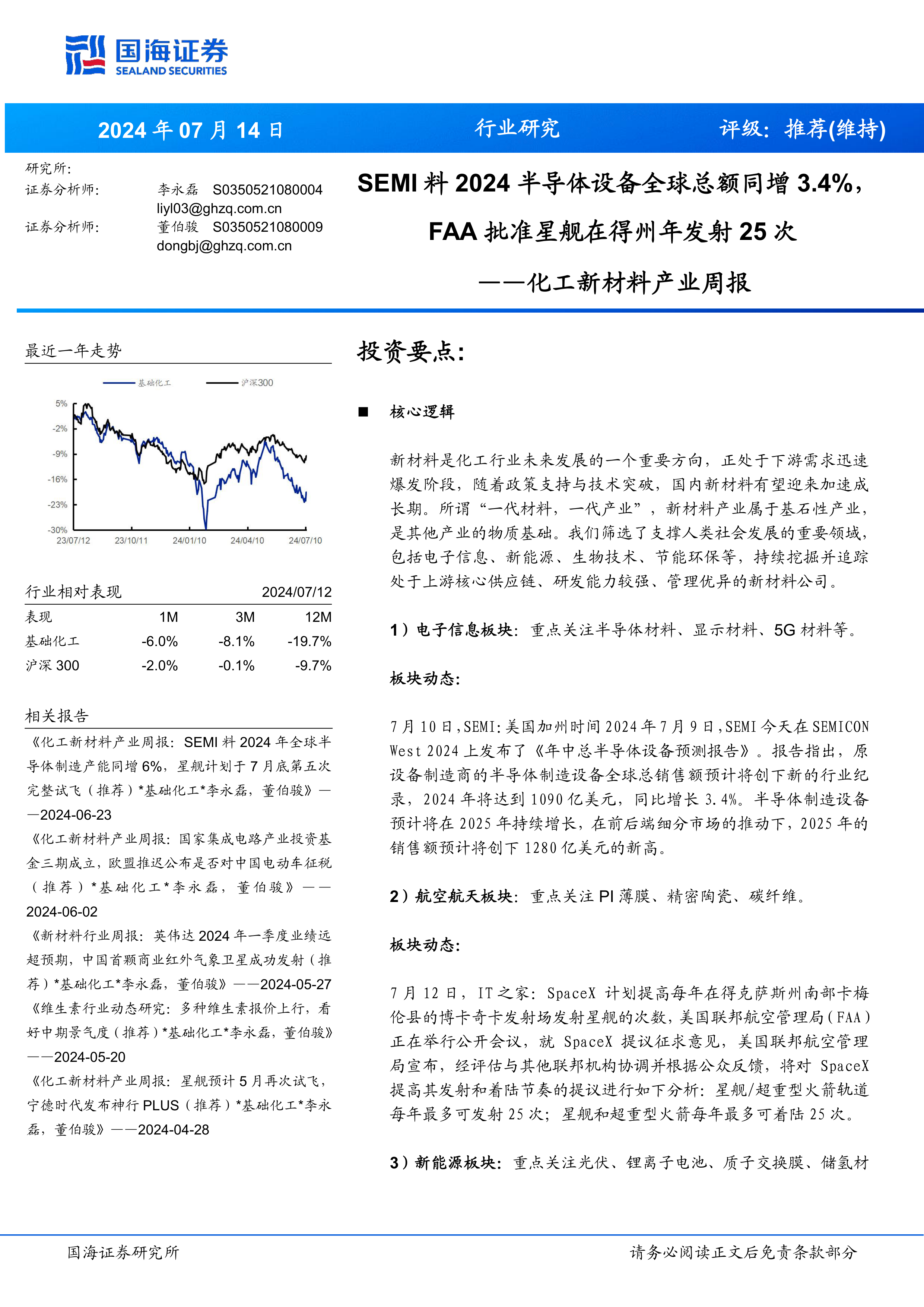 化工新材料产业周报:SEMI料2024半导体设备全球总额同增3.4%,FAA批准星舰在得州年发射25次