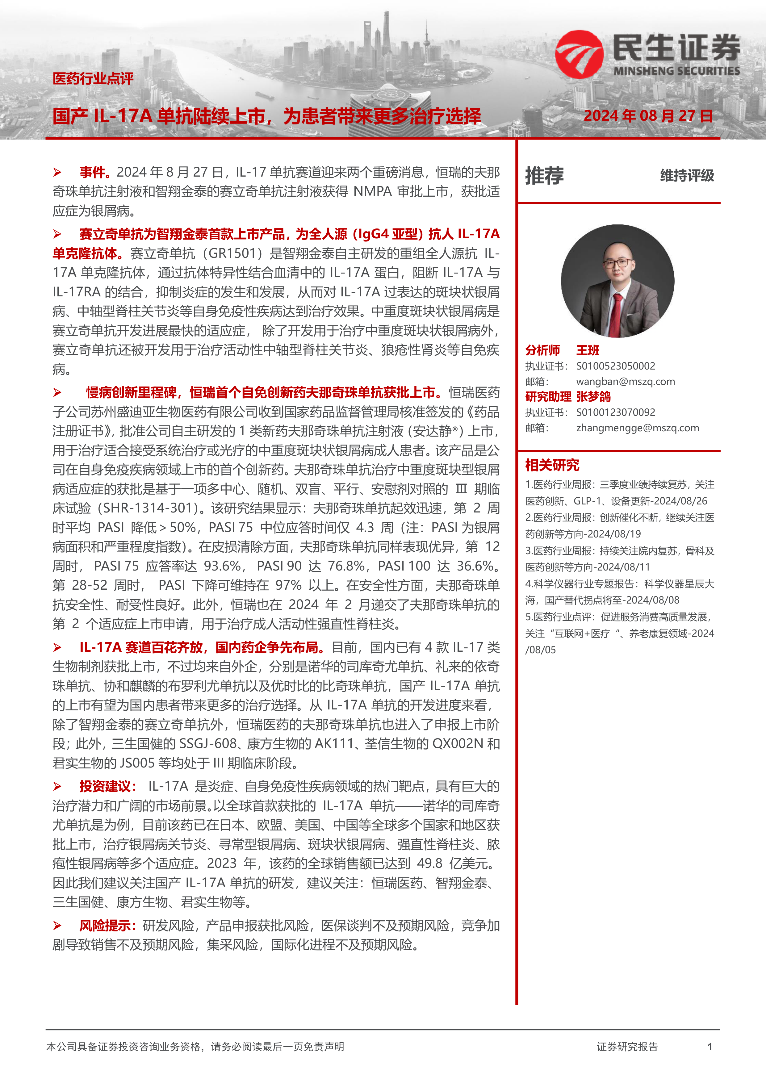 事件。2024年8月27日,IL-17单抗赛道迎来两个重磅消息,恒瑞的夫那奇珠单抗注射液和智翔金泰的赛立奇单抗注射液获得NMPA审批上市,获批适应症为银屑病。