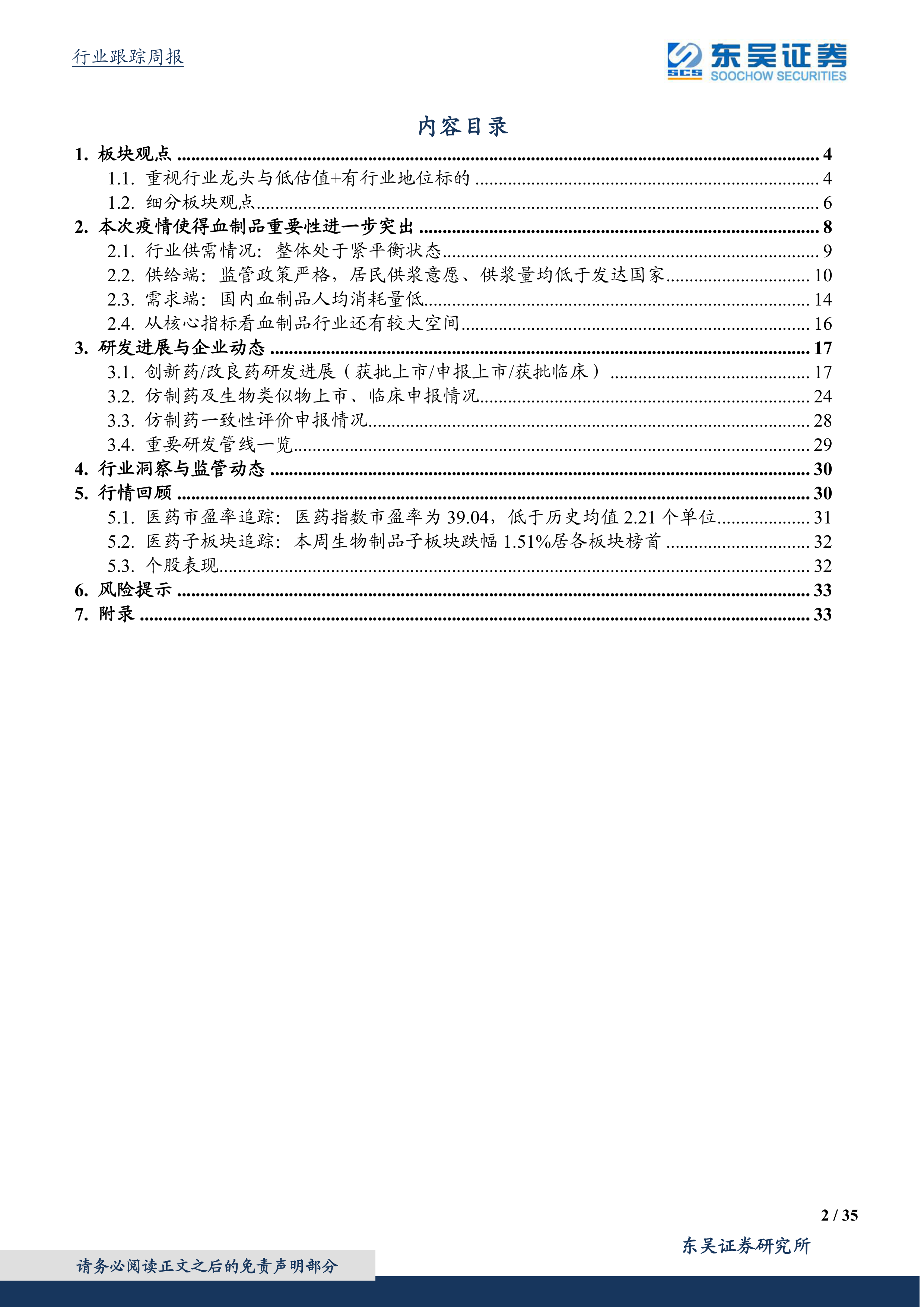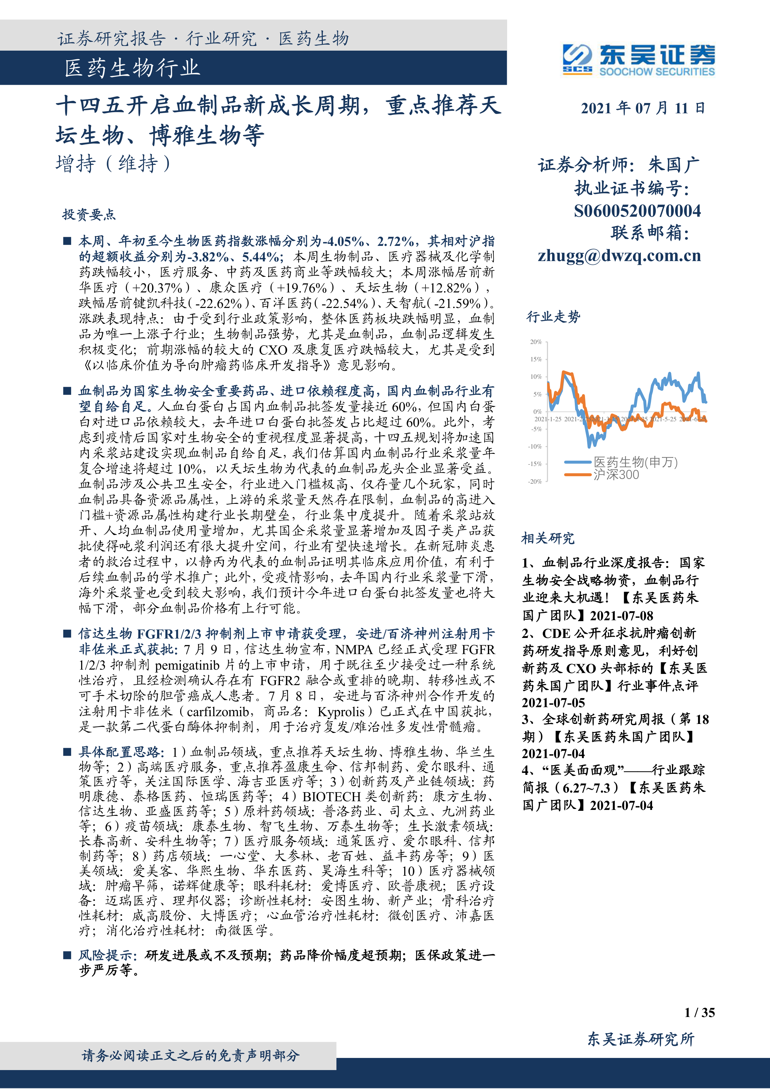 本报告的核心观点是:血制品行业由于其国家生物安全战略物资属性、高进入门槛和资源品属性,在经历了短期疫情影响后,正开启新的成长周期。 报告重点推荐天坛生物、博雅生物等血制品龙头企业,并对医药行业其他细分板块,如创新药、医疗器械、疫苗等,也给出了投资建议。