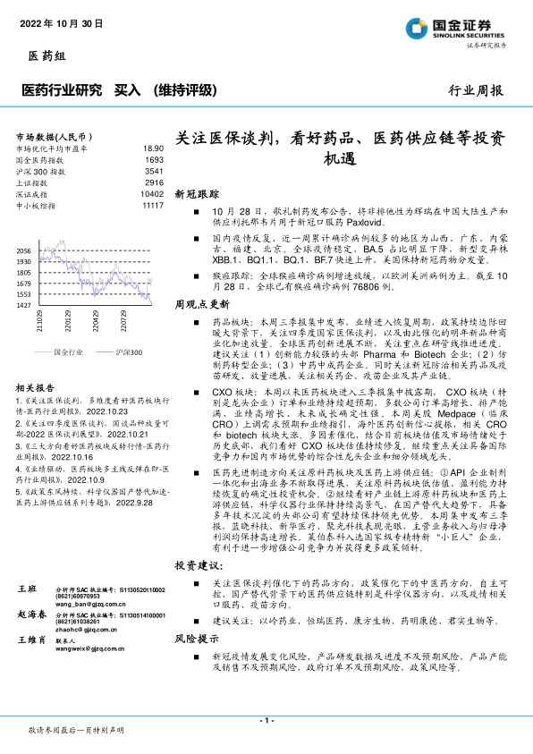 本报告的核心观点是:看好医药板块的投资机会,尤其关注医保谈判催化下的药品方向、政策催化下的中医药方向、自主可控和国产替代背景下的医药供应链(特别是科学仪器方向),以及疫情相关的口服药和疫苗方向。 报告基于对近期市场数据、新冠疫情和猴痘疫情的跟踪分析,以及对医药板块(包括药品、CXO、原料药及医药上游供应链)三季报业绩的解读,得出上述结论。 部分细分领域估值已处于历史底部,具备较强的估值修复潜力。
