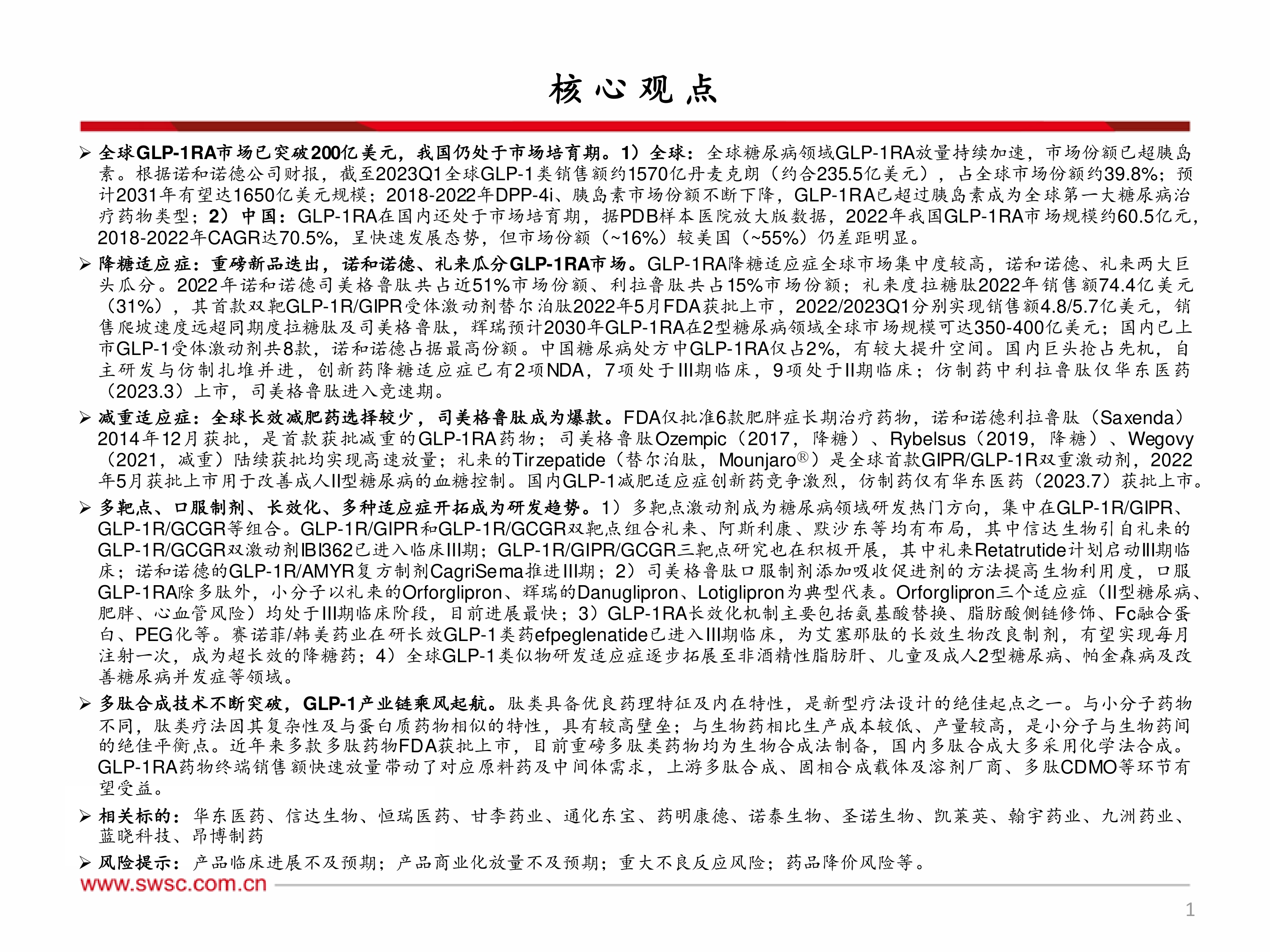 本报告的核心观点是:全球GLP-1RA市场规模已突破200亿美元,并持续高速增长,预计2031年将达到1650亿美元;中国市场虽然仍处于培育期,但增长潜力巨大,预计未来几年将迎来快速发展。GLP-1RA在降糖和减重领域均展现出显著疗效,并成为研发热点,多靶点、口服制剂、长效化成为主要研发趋势。多肽合成技术的突破将进一步推动GLP-1产业链发展,相关企业有望受益。