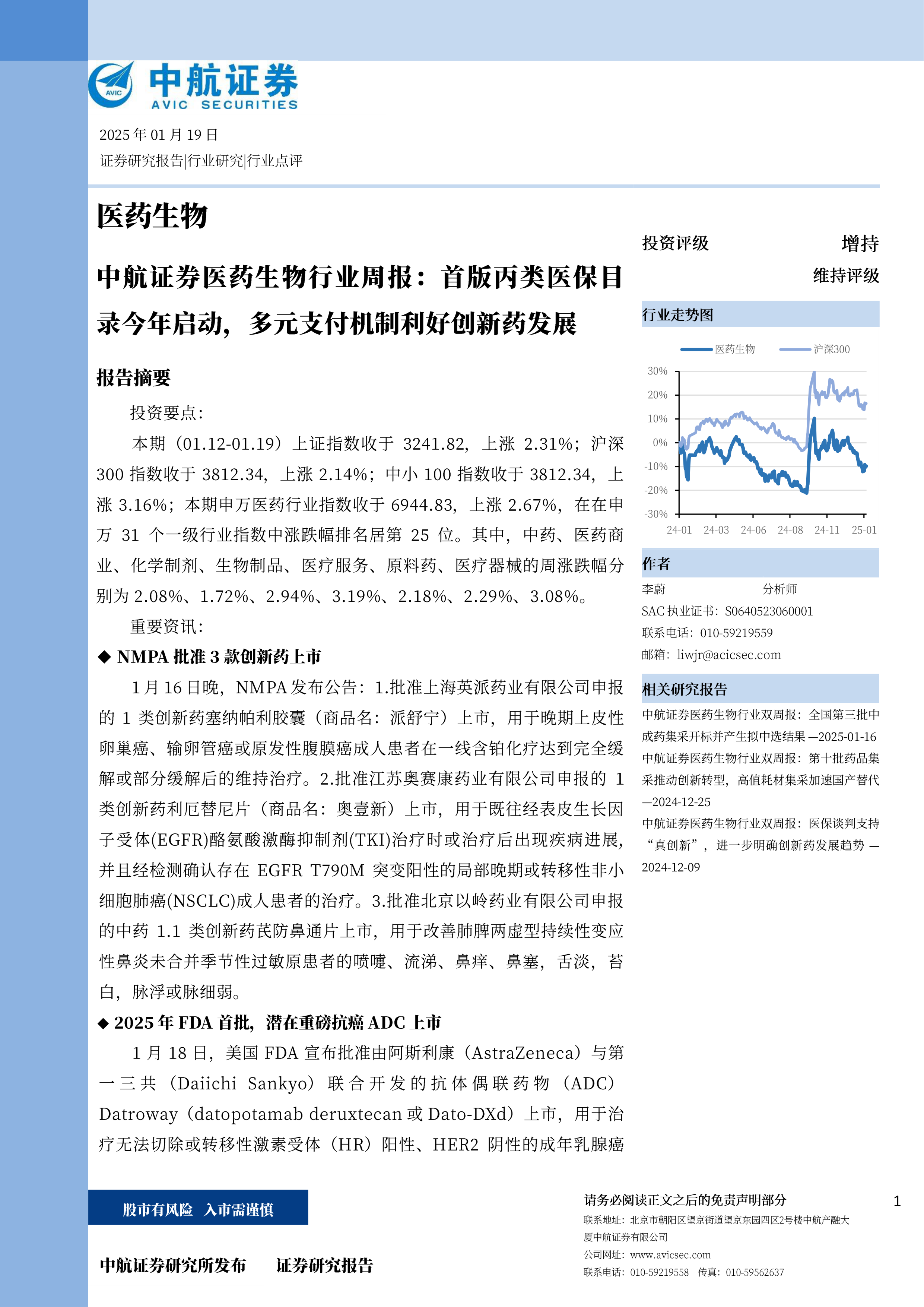 本期(01.12-01.19)上证指数收于3241.82,上涨2.31%;沪深300指数收于3812.34,上涨2.14%;中小100指数收于3812.34,上涨3.16%;本期申万医药行业指数收于6944.83,上涨2.67%,在在申万31个一级行业指数中涨跌幅排名居第25位。其中,中药、医药商业、化学制剂、生物制品、医疗服务、原料药、医疗器械的周涨跌幅分别为2.08%、1.72%、2.94%、3.19%、2.18%、2.29%、3.08%。重要资讯: