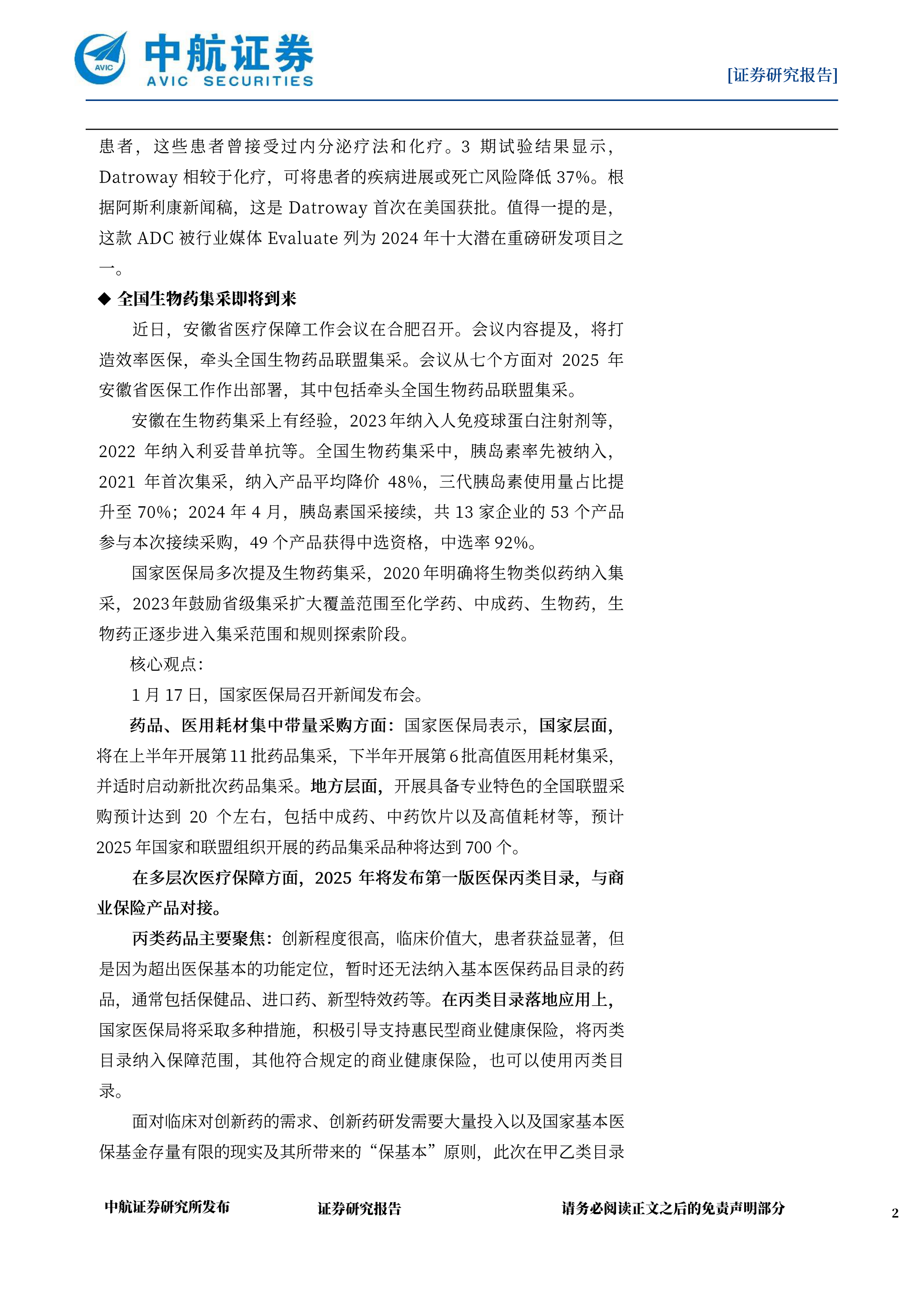 的基础上研究制定丙类目录,是基本医保药品目录的有效补充,同时也是完善我国医疗保障药品目录体系的一次重大尝试。此次尝试或将有助于支持商业健康保险在多层次医疗保障体系中发挥更大作用;此外,有利于构建创新药多元支付机制,支持医药新质生产力发展。