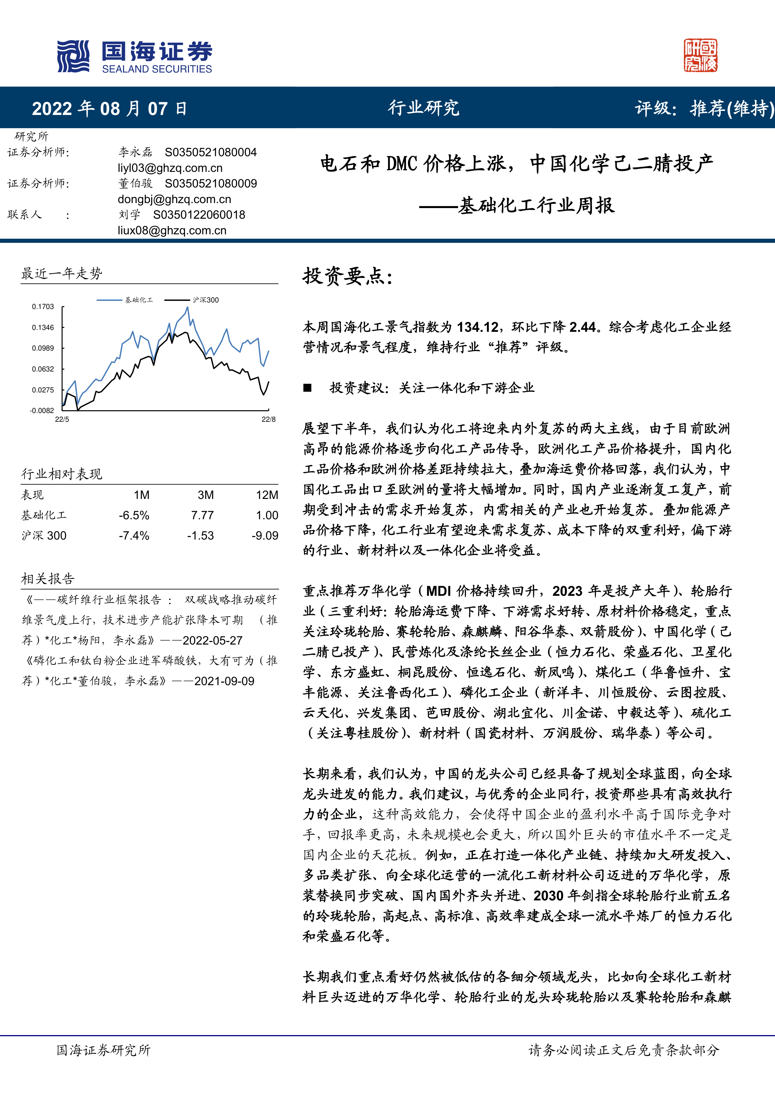 本周国海化工景气指数为 134.12,环比下降 2.44。综合考虑化工企业经营情况和景气程度,维持行业“推荐”评级。