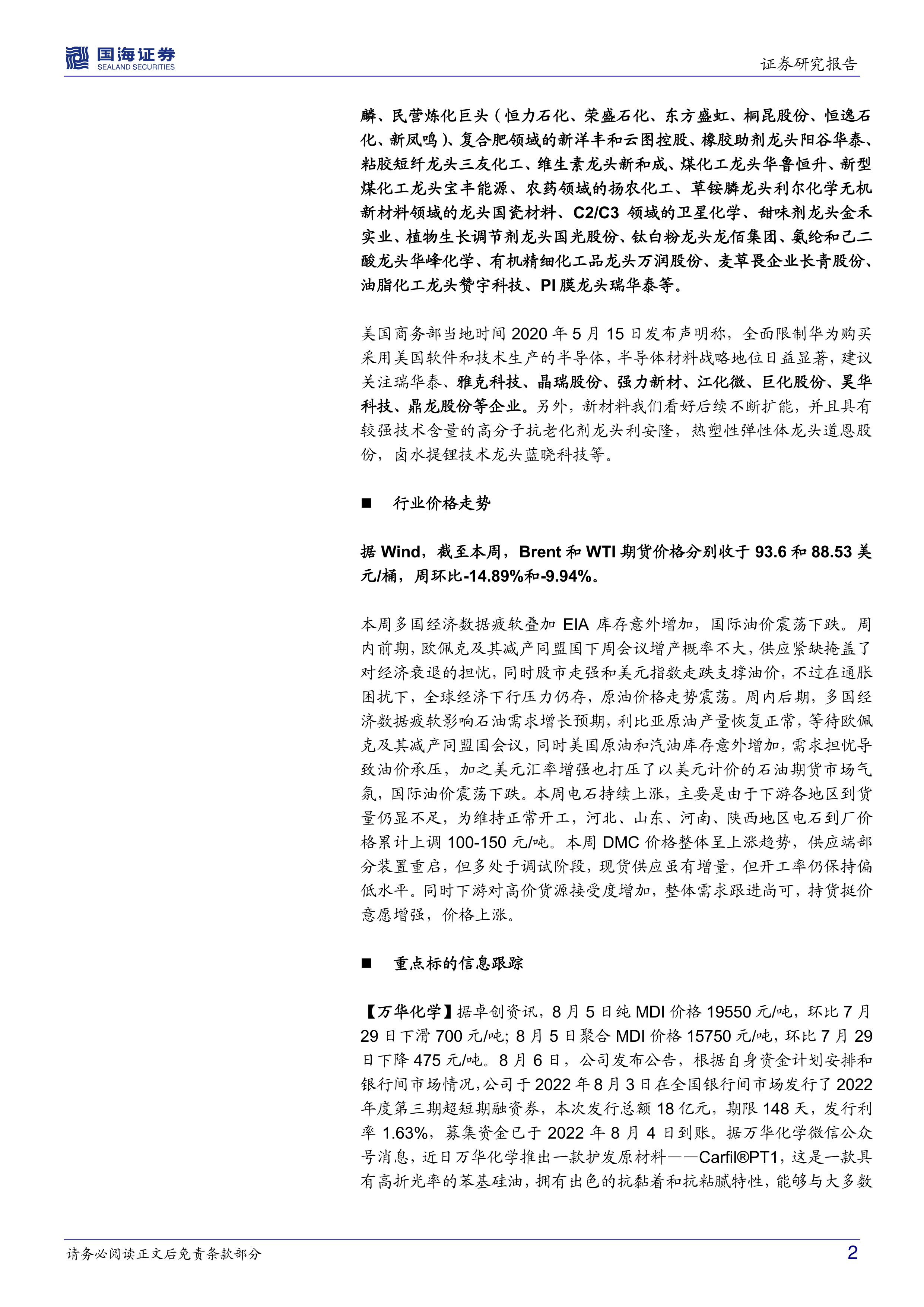 【万华化学】 据卓创资讯, 8 月 5 日纯 MDI 价格 19550 元/吨,环比 7 月29 日下滑 700 元/吨; 8 月 5 日聚合 MDI 价格 15750 元/吨,环比 7 月 29日下降 475 元/吨。8 月 6 日,公司发布公告,根据自身资金计划安排和银行间市场情况,公司于 2022 年 8 月 3 日在全国银行间市场发行了 2022年度第三期超短期融资券,本次发行总额 18 亿元,期限 148 天,发行利率 1.63%,募集资金已于 2022 年 8 月 4 日到账。据万华化学微信公众号消息,近日万华化学推出一款护发原材料——Carfil®PT1,这是一款具有高折光率的苯基硅油,拥有出色的抗黏着和抗粘腻特性,能够与大多数的护理品成分混溶。