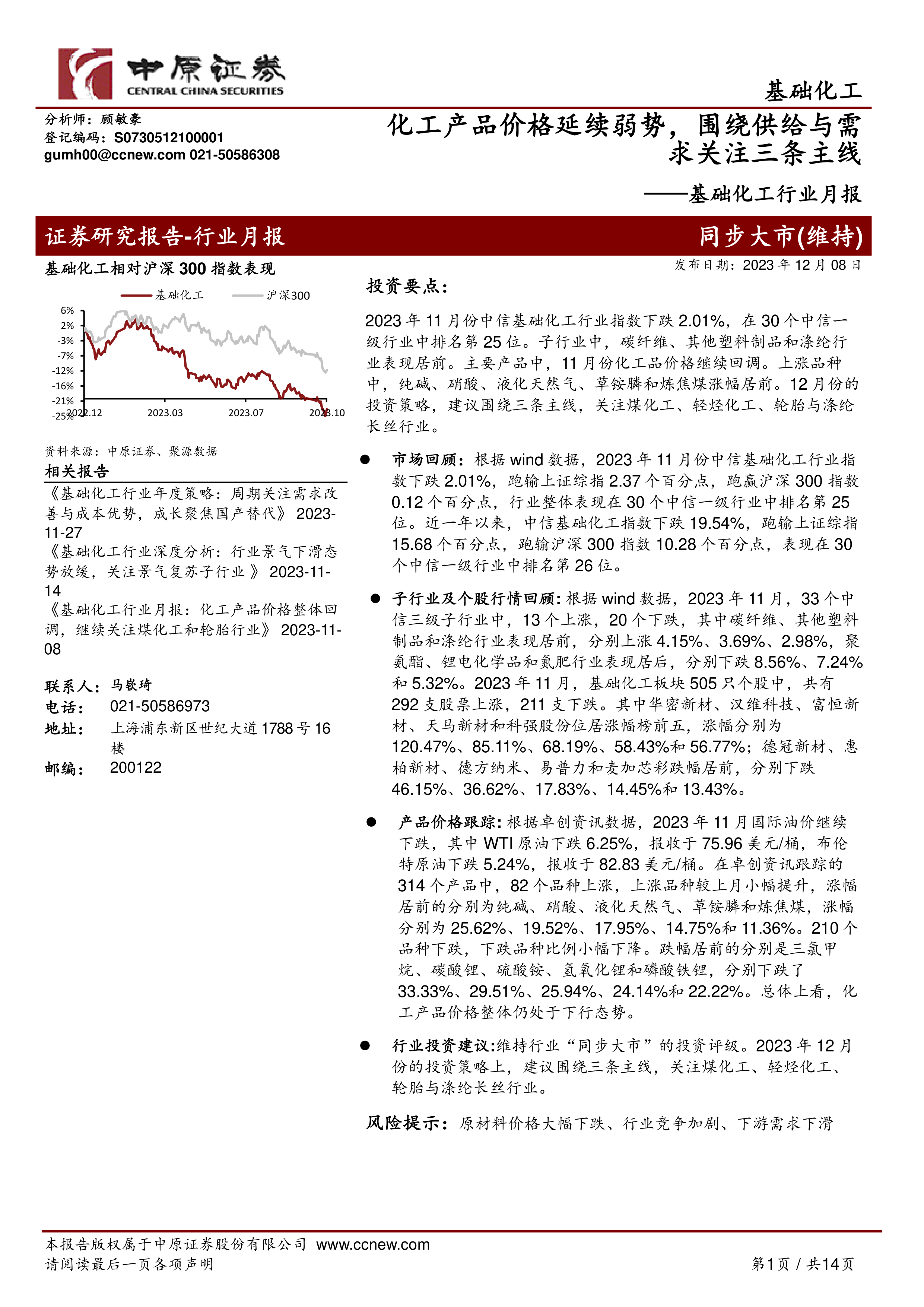行业投资建议:维持行业“同步大市”的投资评级。2023年12月份的投资策略上,建议围绕三条主线,关注煤化工、轻烃化工、轮胎与涤纶长丝行业。