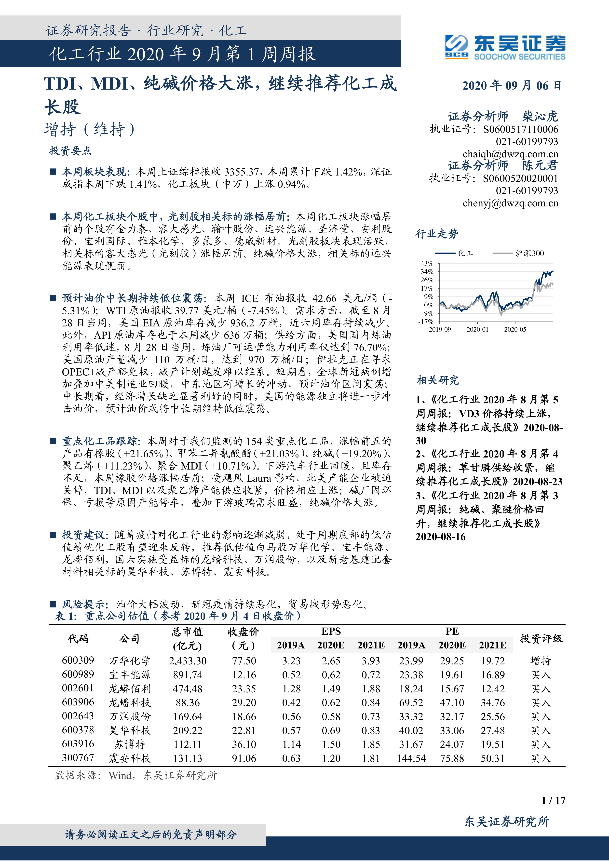 化工行业2020年9月第1周周报:TDI、MDI、纯碱价格大涨,继续推荐化工成长股