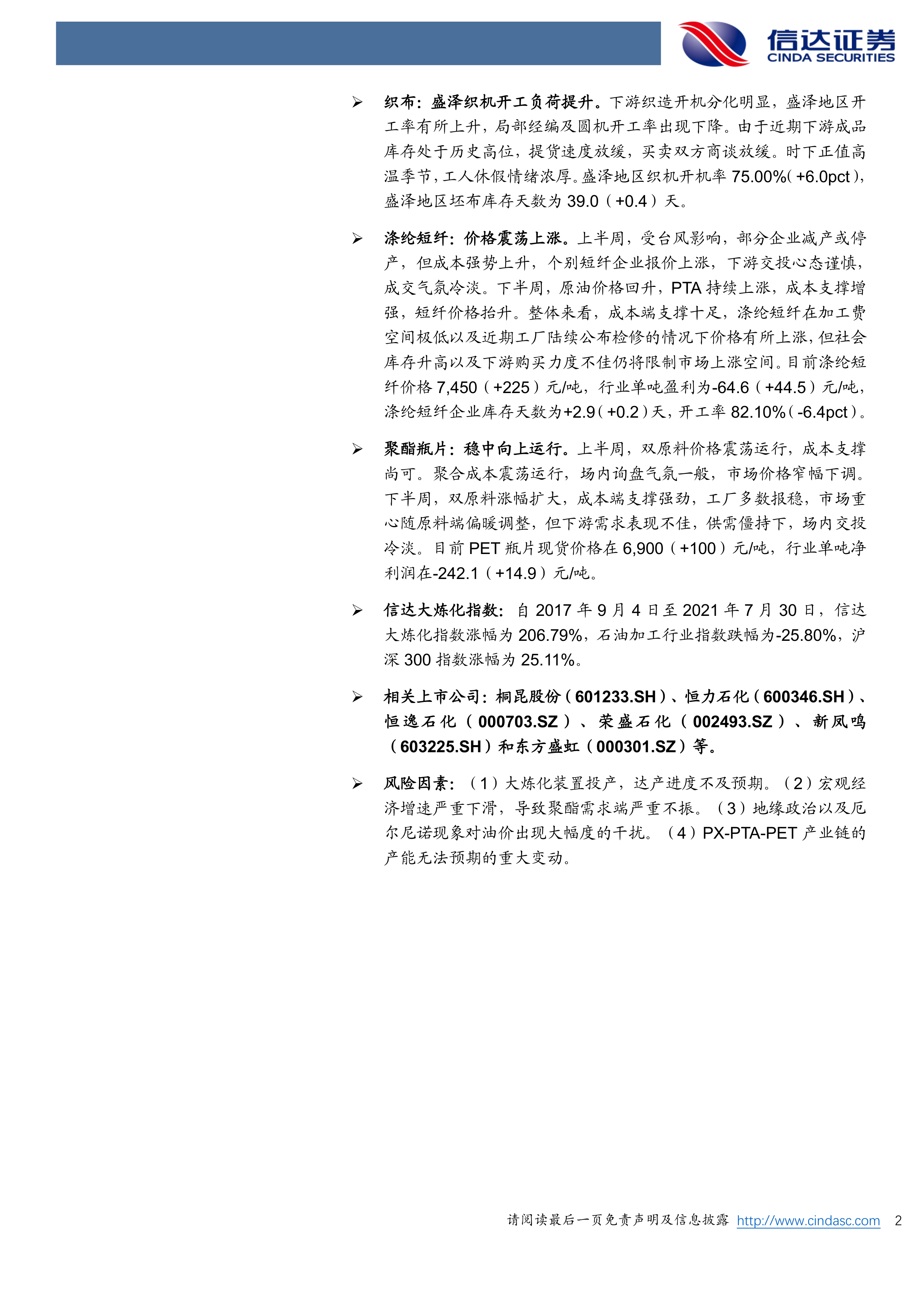 本报告基于信达证券的研究,对2021年8月第一周PTA及相关化工产品的市场行情进行了数据分析。短期内,原油价格上涨和供应减少刺激PTA利润回升,但下游需求疲软和高加工费限制了其上涨空间。其他化工产品价格和利润也受到多种因素的综合影响,呈现波动和分化态势。信达大炼化指数的持续上涨反映了炼化行业整体的良好发展态势,但投资者仍需关注报告中提到的风险因素。 本报告仅供参考,不构成投资建议。