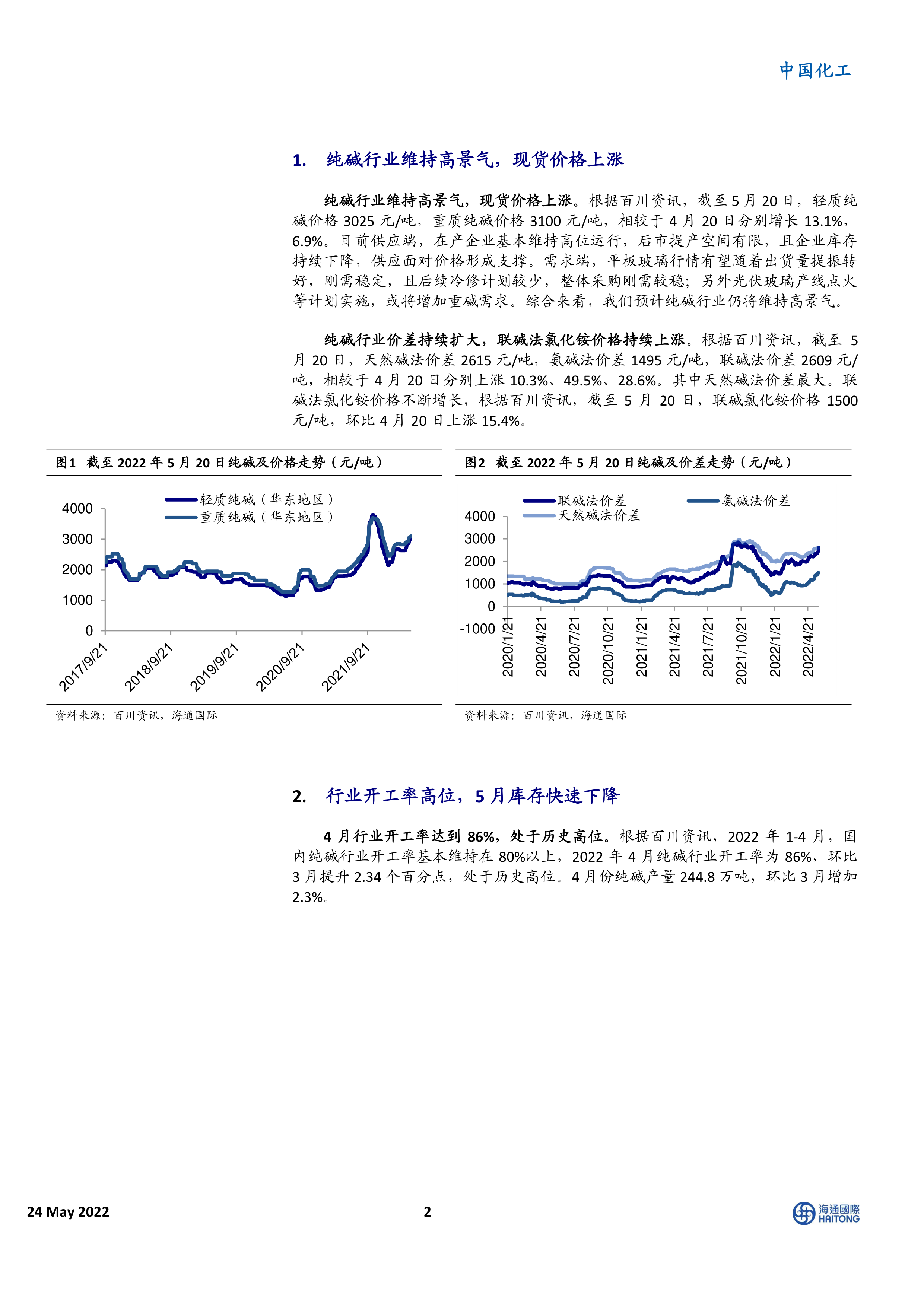 纯碱行业维持高景气,现货价格上涨。根据百川资讯,截至5月20日,轻质纯碱价格3025元/吨,重质纯碱价格3100元/吨,相较于4月20日分别增长13.1%,6.9%。纯碱行业价差持续扩大,联碱法氯化铵价格持续上涨。根据百川资讯,截至5月20日,天然碱法价差2615元/吨,氨碱法价差1495元/吨,联碱法价差2609元/吨,相较于4月20日分别上涨10.3%、49.5%、28.6%。目前供应端,在产企业基本维持高位运行,后市提产空间有限,且企业库存持续下降,供应面对价格形成支撑。需求端,平板玻璃行情有望随着出货量提振转好,刚需稳定,且后续冷修计划较少,整体采购刚需较稳;另外光伏玻璃产线点火等计划实施,或将增加重碱需求。综合来看,我们预计纯碱行业仍将维持高景气。