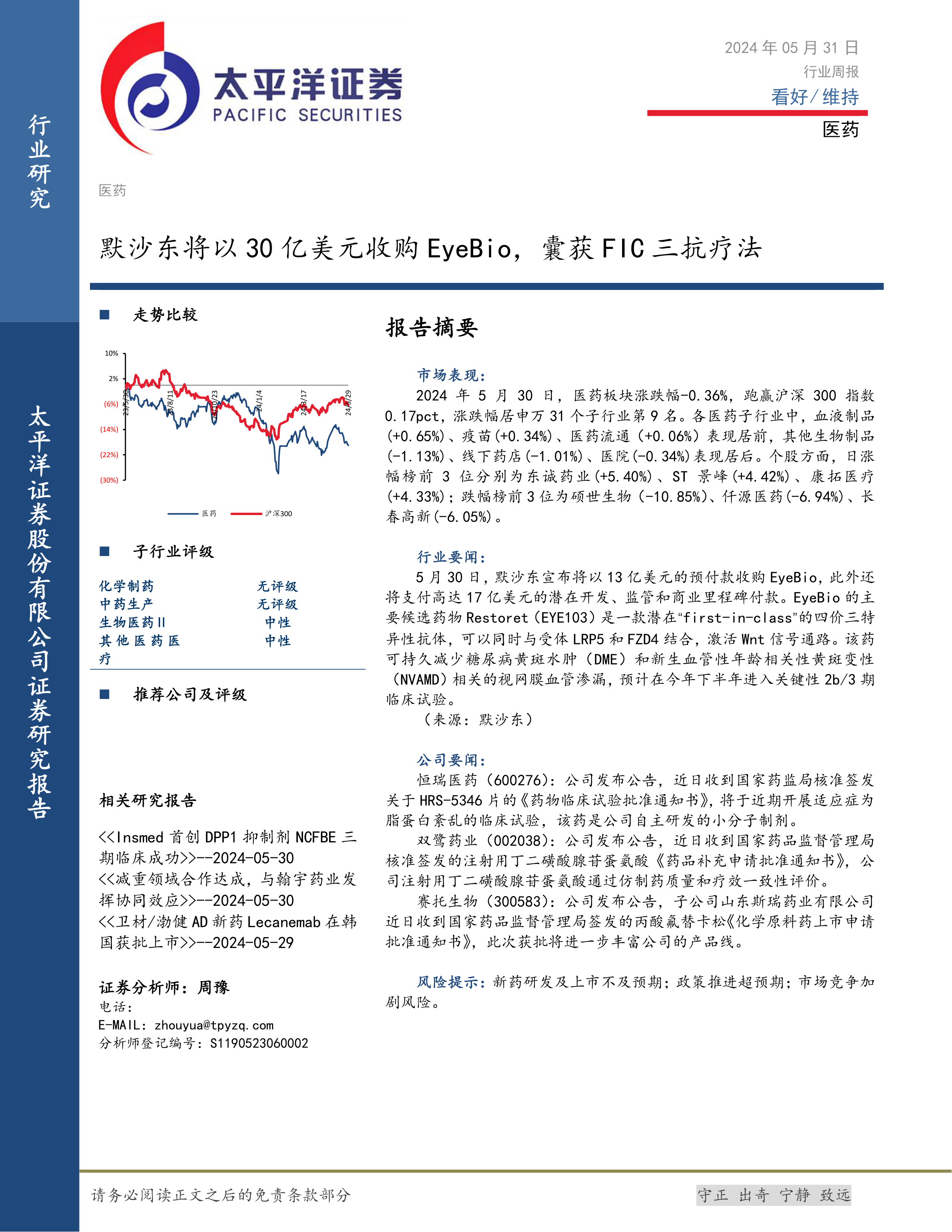 本报告的核心观点是:医药行业整体表现平稳,部分细分领域表现突出,默沙东收购EyeBio事件对行业发展具有重要影响。 具体而言,报告分析了医药行业近期市场表现、子行业评级、行业要闻以及公司要闻,并对未来走势进行了展望。