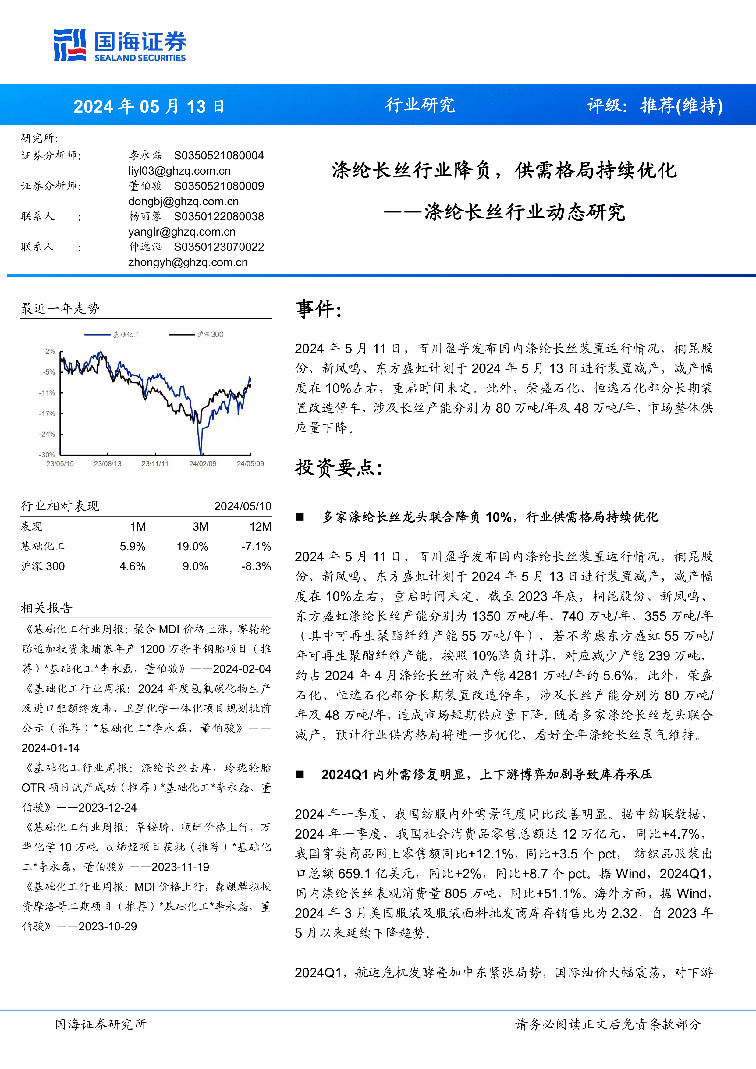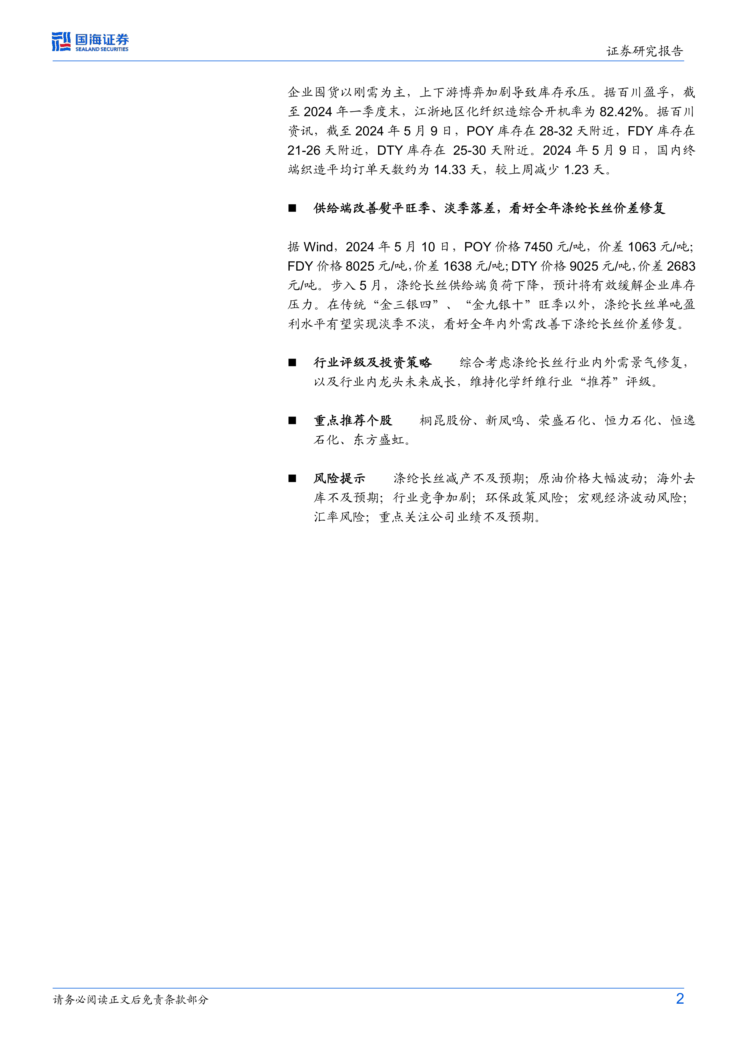 报告首先概述了涤纶长丝行业近期动态,重点在于多家龙头企业联合减产的消息,以及荣盛石化和恒逸石化装置停车改造对市场供应的影响。 投资要点则强调了行业供需格局持续优化,以及2024年一季度内外需修复明显,看好全年涤纶长丝景气度维持和价差修复。