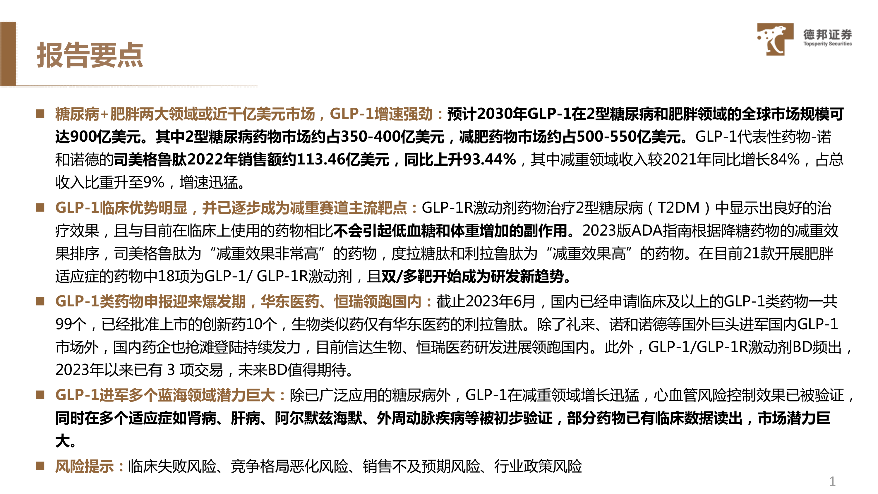 本报告的核心观点是:GLP-1类药物市场潜力巨大,预计2030年全球市场规模将达到900亿美元,其中糖尿病和肥胖领域分别贡献350-400亿美元和500-550亿美元。GLP-1类药物临床优势明显,已成为减重赛道主流靶点,并正在拓展至心血管疾病、肾病、肝病等多个蓝海领域。国内GLP-1类药物研发进入爆发期,但仍以外资企业为主导,国产药物研发进展迅速,未来BD合作值得期待。