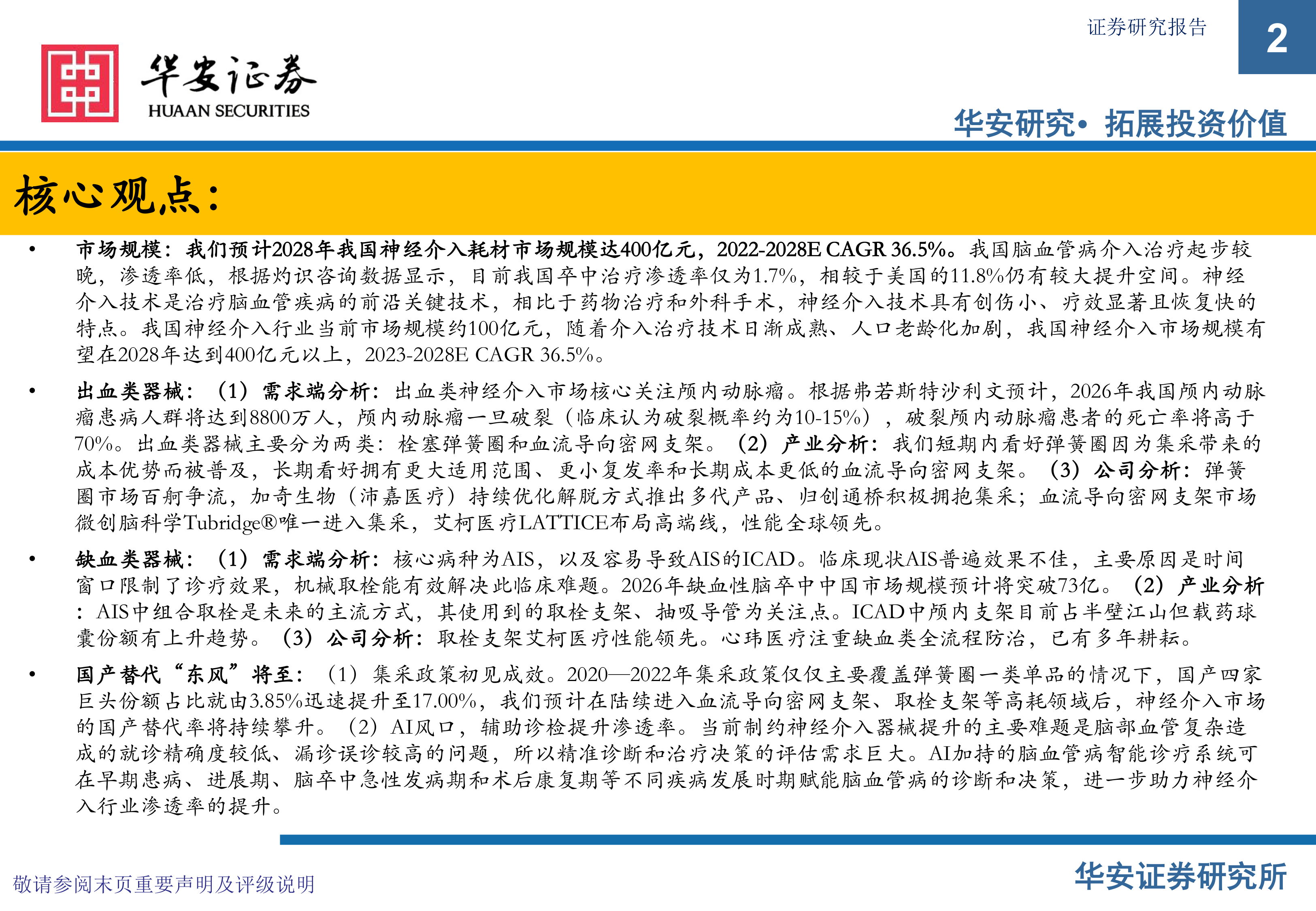 报告首先概述了脑血管病的分类、发病率和死亡率,以及神经介入治疗的优势。数据显示,脑血管病是导致我国居民死亡和致残的主要疾病之一,而神经介入技术作为一种创伤小、疗效显著的治疗方法,市场需求巨大。