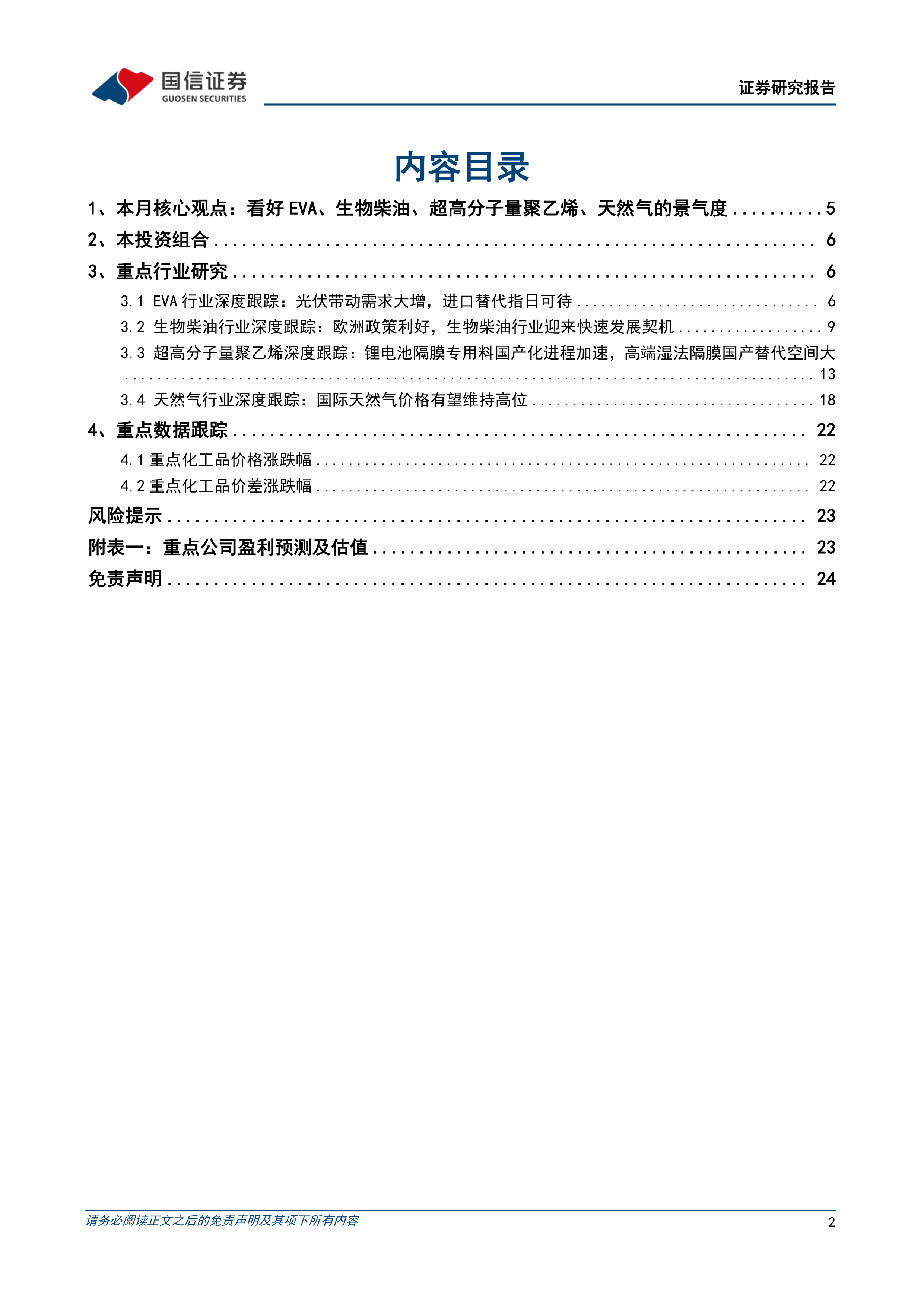 本报告基于对国际油价走势、下游需求以及国内产能的综合分析,看好EVA、生物柴油、超高分子量聚乙烯和天然气四个行业的景气度,并推荐了相关领域的重点公司。报告也指出了原油价格波动、海外疫情以及需求不及预期等潜在风险。投资者应谨慎评估风险,结合自身情况做出投资决策。 报告中提供的公司投资评级和盈利预测仅供参考,不构成投资建议。