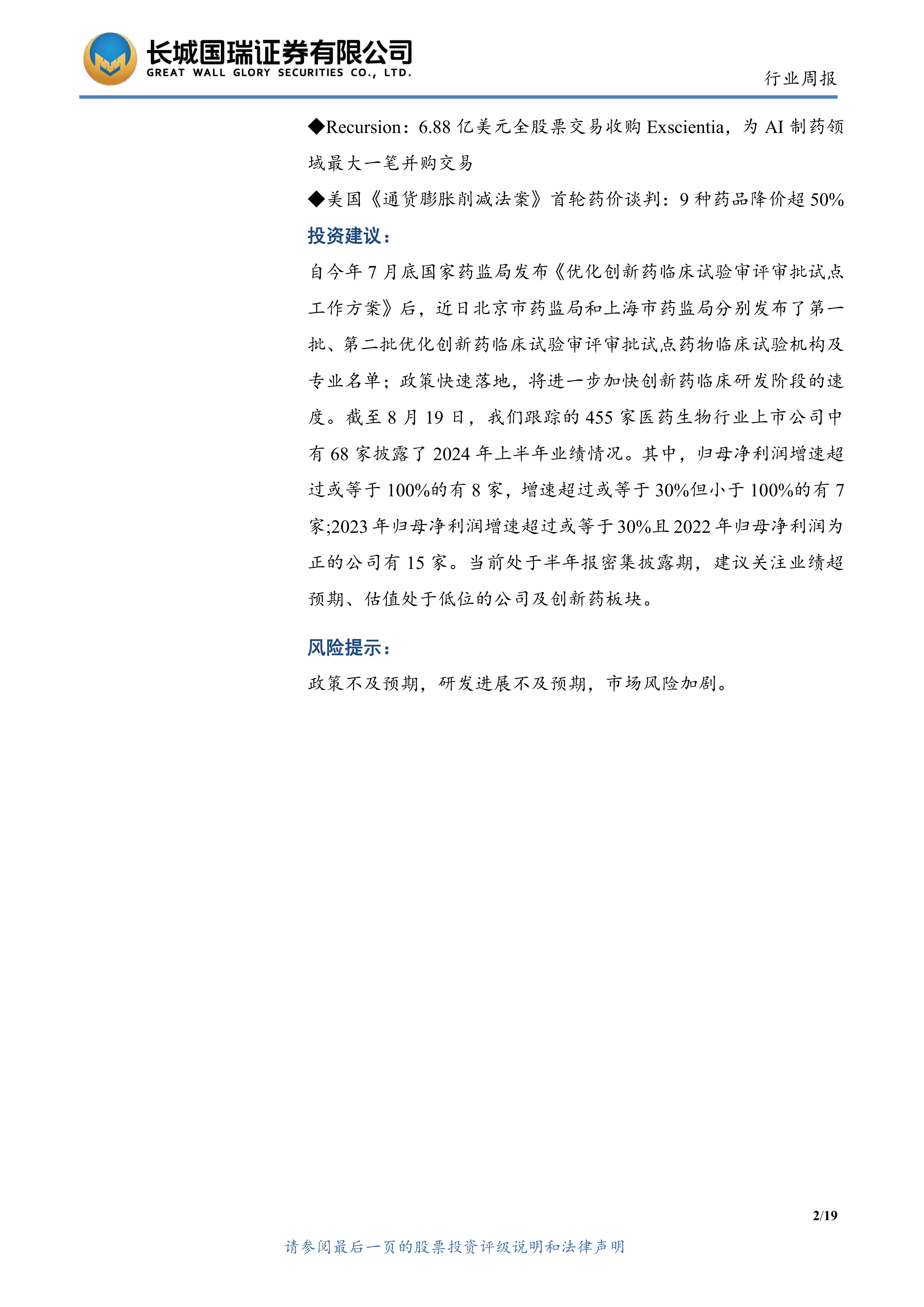 自今年7月底国家药监局发布《优化创新药临床试验审评审批试点工作方案》后,近日北京市药监局和上海市药监局分别发布了第一批、第二批优化创新药临床试验审评审批试点药物临床试验机构及专业名单;政策快速落地,将进一步加快创新药临床研发阶段的速度。截至8月19日,我们跟踪的455家医药生物行业上市公司中有68家披露了2024年上半年业绩情况。其中,归母净利润增速超过或等于100%的有8家,增速超过或等于30%但小于100%的有7家;2023年归母净利润增速超过或等于30%且2022年归母净利润为正的公司有15家。当前处于半年报密集披露期,建议关注业绩超预期、估值处于低位的公司及创新药板块。