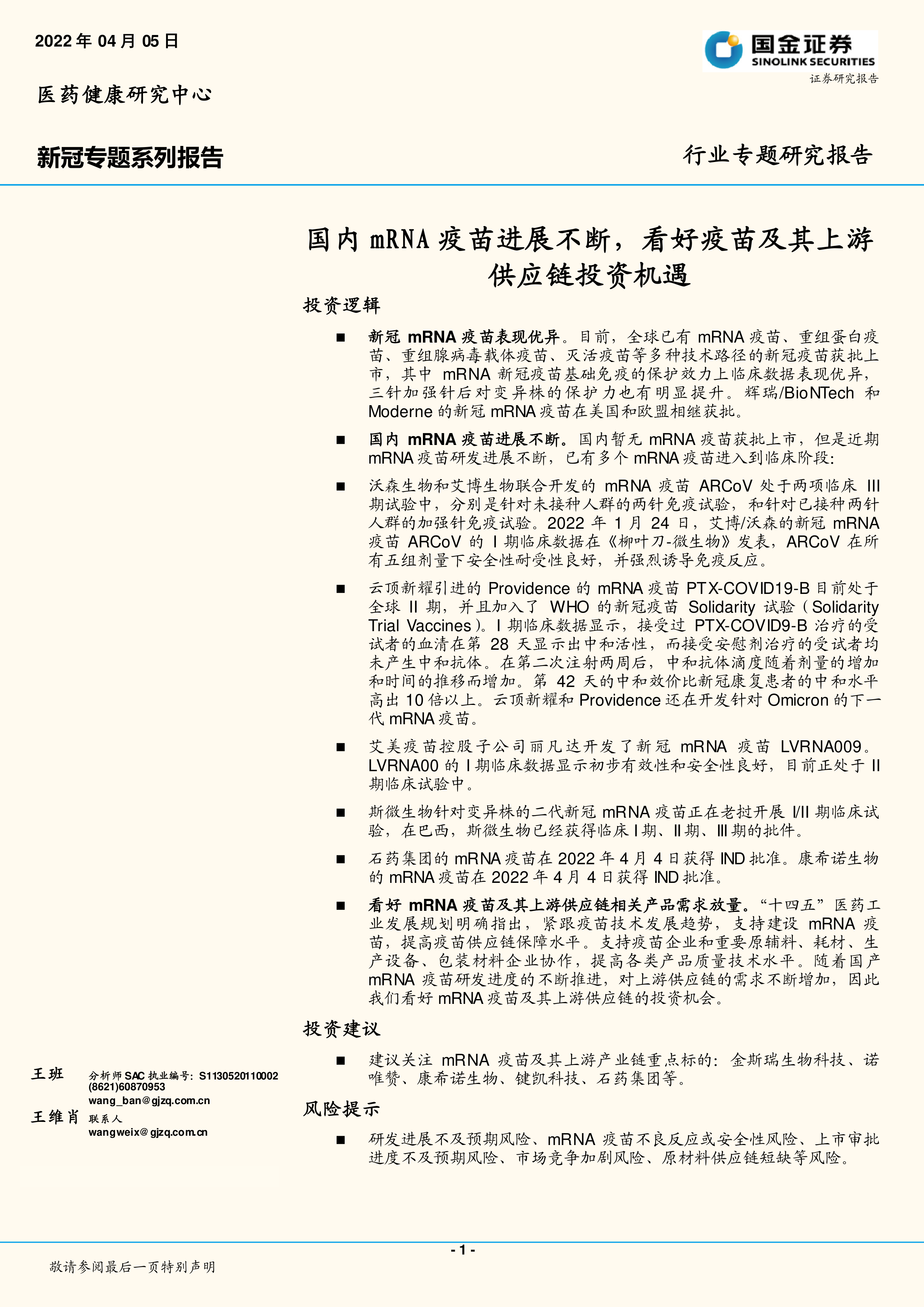 本报告对国内外mRNA新冠疫苗的研发进展和市场前景进行了深入分析。全球范围内,mRNA疫苗已证明其有效性和安全性,并在欧美获批上市。国内mRNA疫苗研发虽然起步较晚,但进展迅速,多个候选疫苗已进入临床试验阶段,未来市场潜力巨大。同时,报告强调了mRNA疫苗上游供应链的投资机遇,建议投资者关注相关企业,但同时也提示了研发风险、安全风险、审批风险、市场竞争风险和原材料供应链风险等潜在风险因素。 投资者需谨慎评估风险,做出理性投资决策。