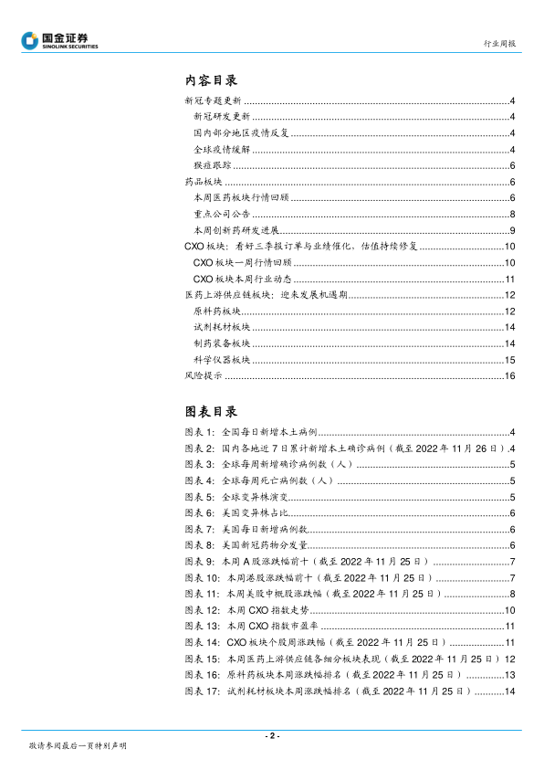 本报告的核心观点是:在关注国家医保谈判以及由此催化的明年新品种商业化加速放量的大背景下,看好医药创新和医药先进制造领域的投资机会。报告基于对新冠疫情、医药板块、CXO板块以及医药上游供应链的分析,建议关注龙头药企估值修复、创新型Biotech研发进展、估值处于底部企业以及中成药(特别是中药创新药)四个方向。 同时,报告也指出了新冠疫情风险、研发风险、销售风险、订单风险和政策风险等潜在风险。