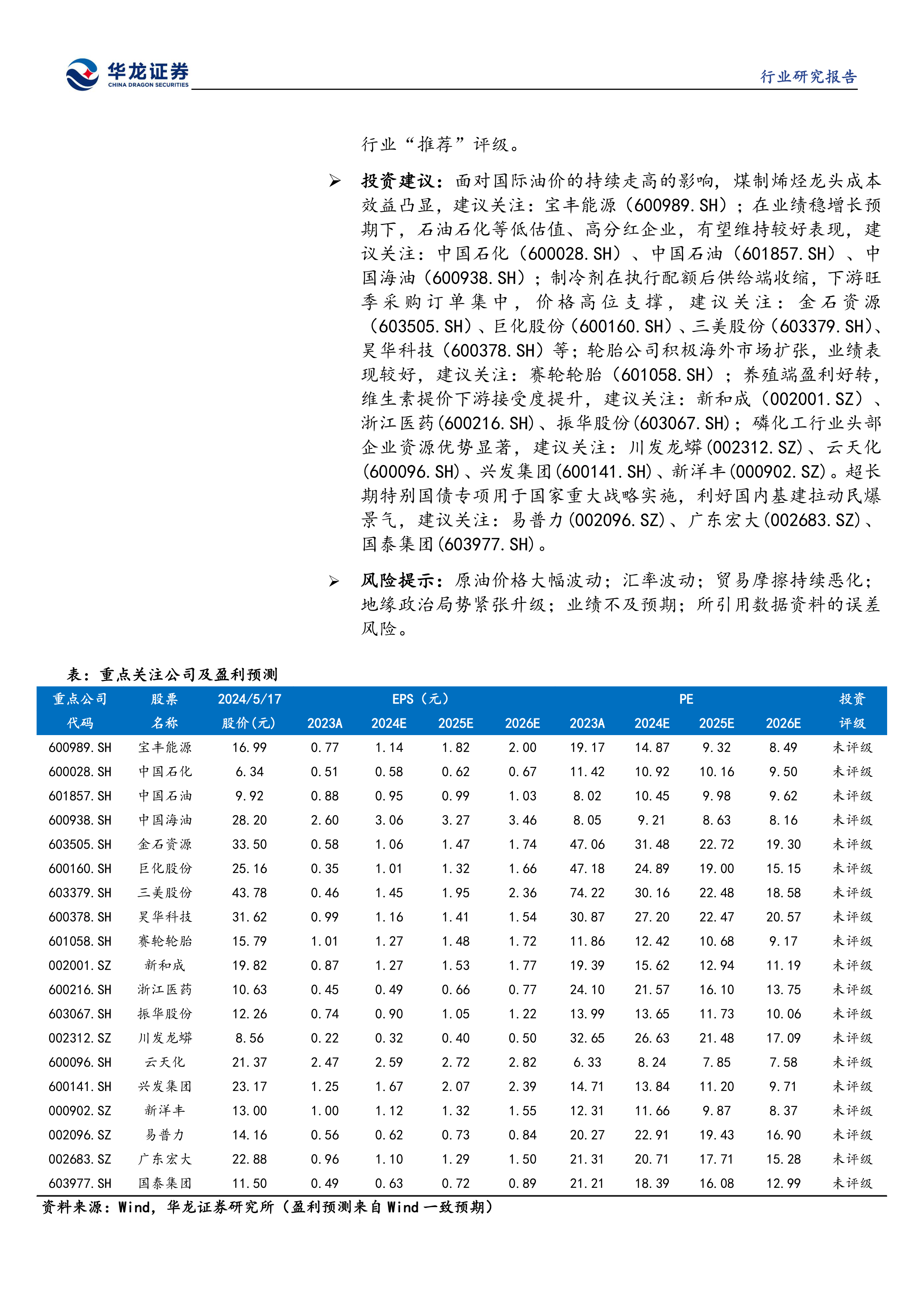 投资建议:面对国际油价的持续走高的影响,煤制烯烃龙头成本效益凸显,建议关注:宝丰能源(600989.SH);在业绩稳增长预期下,石油石化等低估值、高分红企业,有望维持较好表现,建议关注:中国石化(600028.SH)、中国石油(601857.SH)、中国海油(600938.SH);制冷剂在执行配额后供给端收缩,下游旺季采购订单集中,价格高位支撑,建议关注:金石资源(603505.SH)、巨化股份(600160.SH)、三美股份(603379.SH)、昊华科技(600378.SH)等;轮胎公司积极海外市场扩张,业绩表现较好,建议关注:赛轮轮胎(601058.SH);养殖端盈利好转,维生素提价下游接受度提升,建议关注:新和成(002001.SZ)、浙江医药(600216.SH)、振华股份(603067.SH);磷化工行业头部企业资源优势显著,建议关注:川发龙蟒(002312.SZ)、云天化(600096.SH)、兴发集团(600141.SH)、新洋丰(000902.SZ)。超长期特别国债专项用于国家重大战略实施,利好国内基建拉动民爆景气,建议关注:易普力(002096.SZ)、广东宏大(002683.SZ)、国泰集团(603977.SH)。