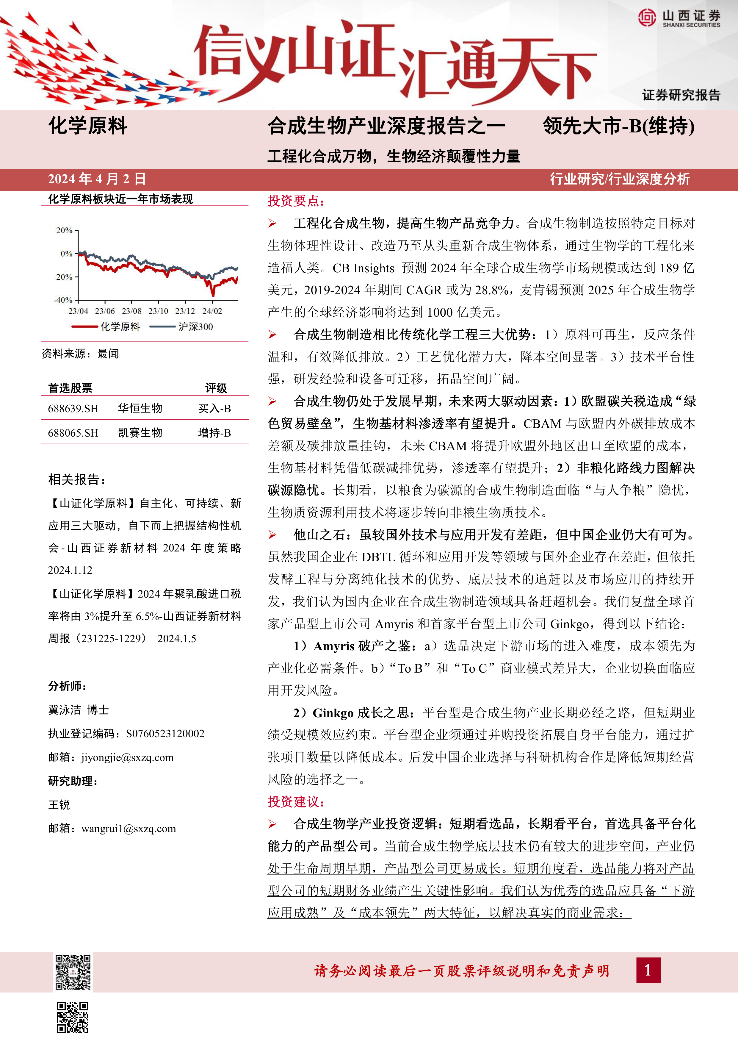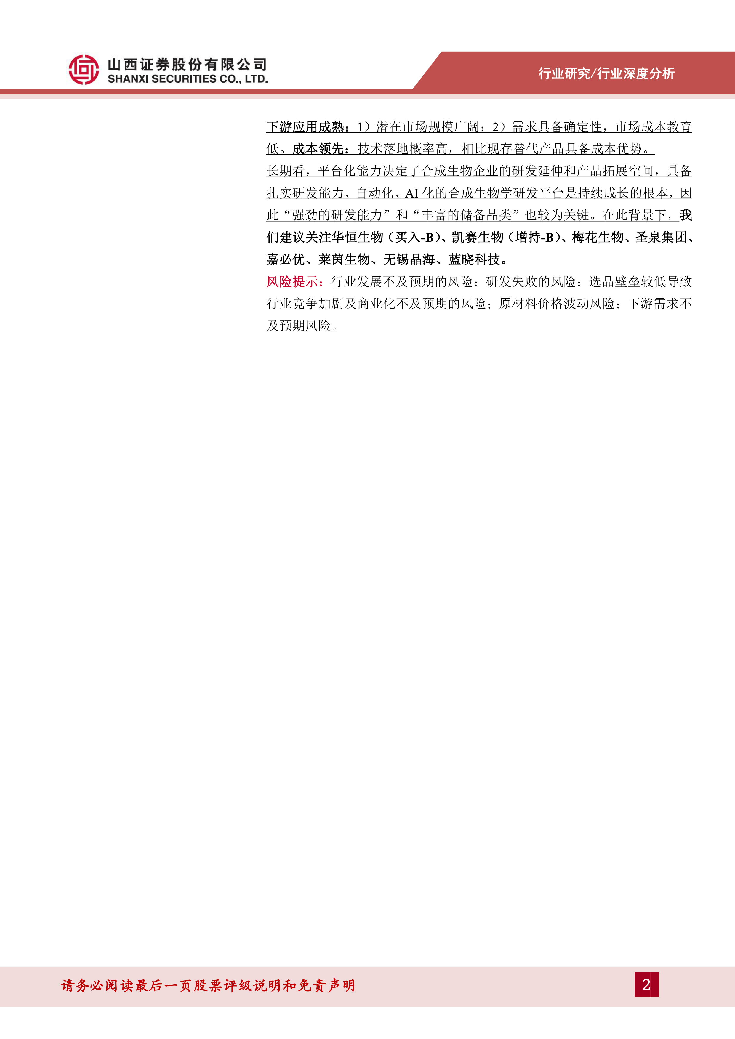 长期看,平台化能力决定了合成生物企业的研发延伸和产品拓展空间,具备扎实研发能力、自动化、AI化的合成生物学研发平台是持续成长的根本,因此“强劲的研发能力”和“丰富的储备品类”也较为关键。在此背景下,我们建议关注华恒生物(买入-B)、凯赛生物(增持-B)、梅花生物、圣泉集团、嘉必优、莱茵生物、无锡晶海、蓝晓科技。