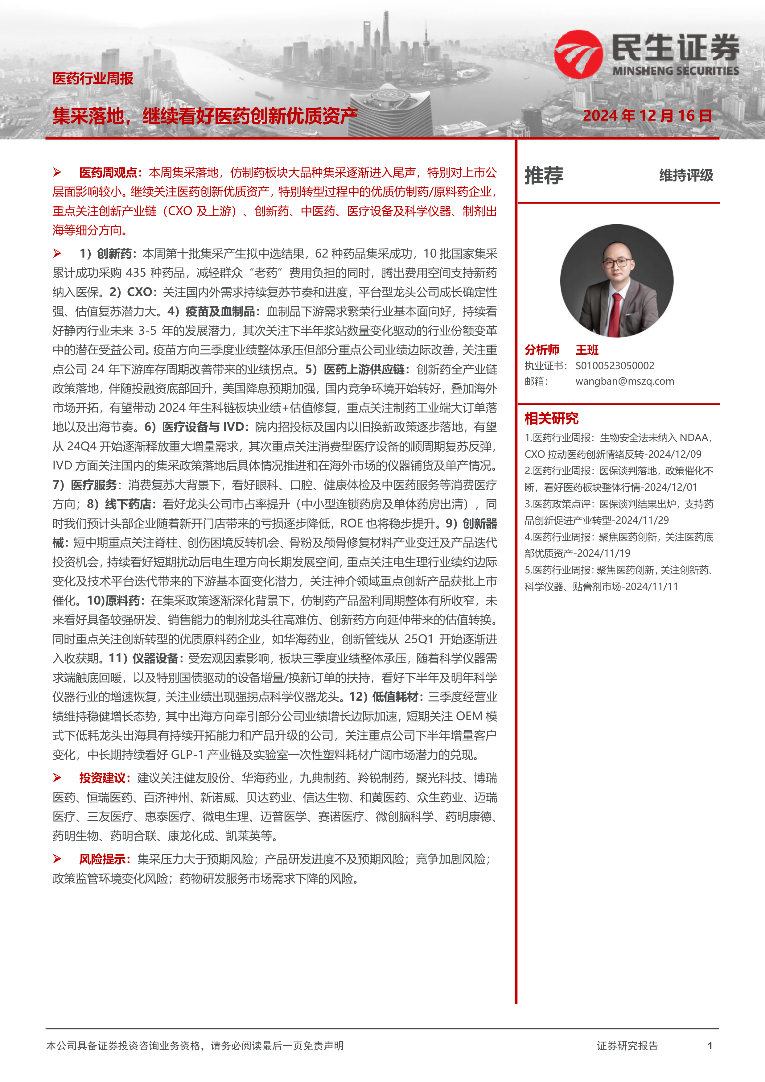风险提示:集采压力大于预期风险;产品研发进度不及预期风险;竞争加剧风险;政策监管环境变化风险;药物研发服务市场需求下降的风险。