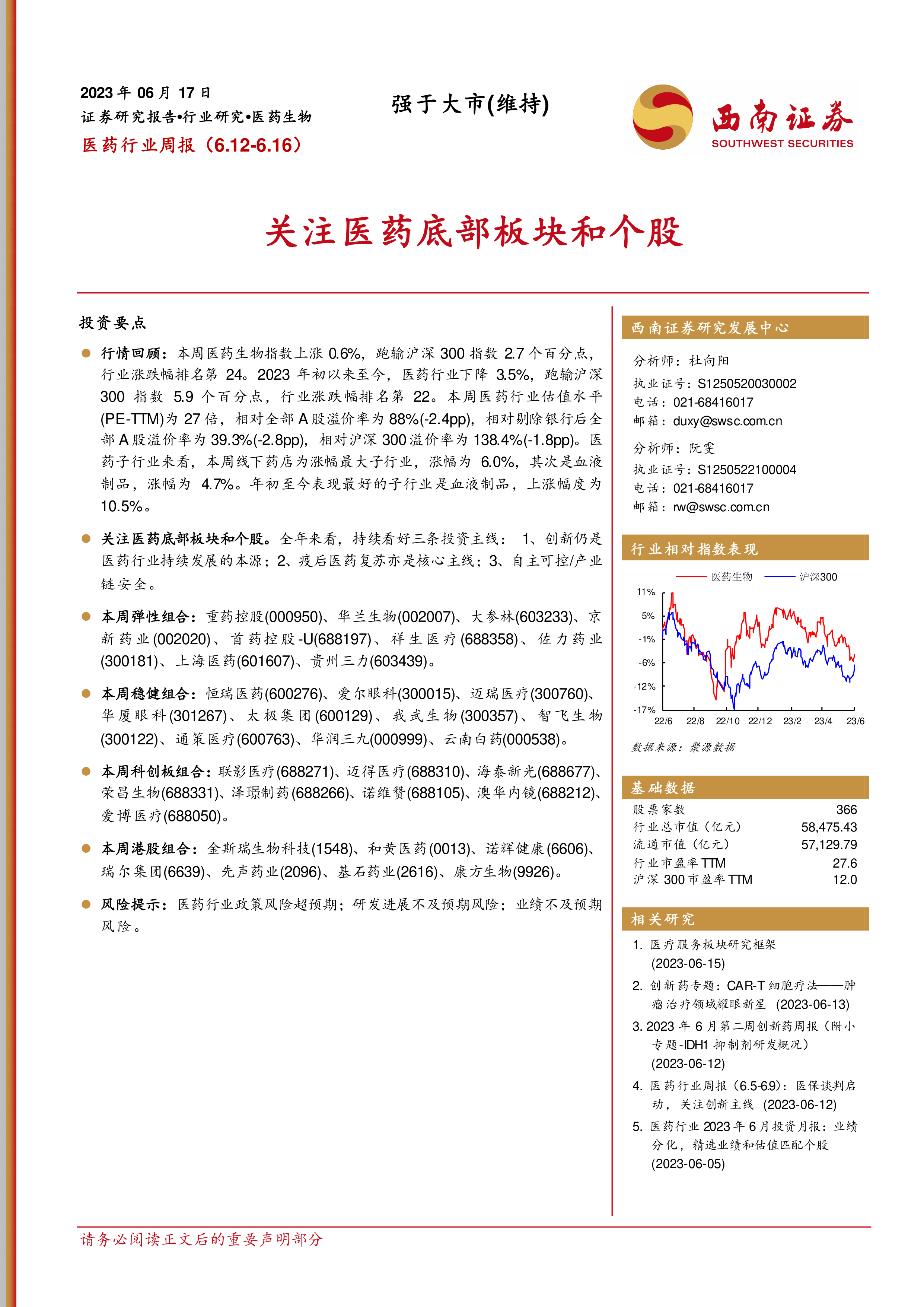 基于这些主线,报告推荐了本周的弹性组合、稳健组合、科创板组合和港股组合。 弹性组合包括重药控股、华兰生物、大参林、京新药业、首药控股-U、祥生医疗、佐力药业、上海医药、贵州三力。上周弹性组合整体下跌2.2%,跑输大盘5.5个百分点,跑输医药指数2.8个百分点。 稳健组合包括恒瑞医药、爱尔眼科、迈瑞医疗、华厦眼科、太极集团、我武生物、智飞生物、通策医疗、华润三九、云南白药。 科创板组合包括联影医疗、迈得医疗、海泰新光、荣昌生物、泽璟制药-U、诺唯赞、澳华内镜、爱博医疗。上周科创板组合整体下降0.6%,跑输大盘3.9个百分点,跑输医药指数1.2个百分点。 港股组合包括金斯瑞生物科技、和黄医药、微创机器人、诺辉健康、瑞尔集团、先声药业、基石药业、康方生物。上周港股组合整体上涨7.4%,跑赢大盘4.1个百分点,跑赢恒生医疗保健指数5.0个百分点。